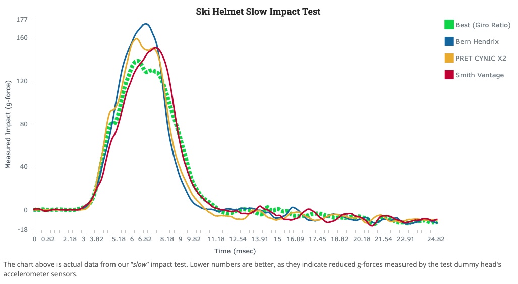 For our “slow” impact test, we drop each helmet from a height of 1.0 meters. This test is meant to replicate the impact felt while falling on your own and your head hitting the ground.