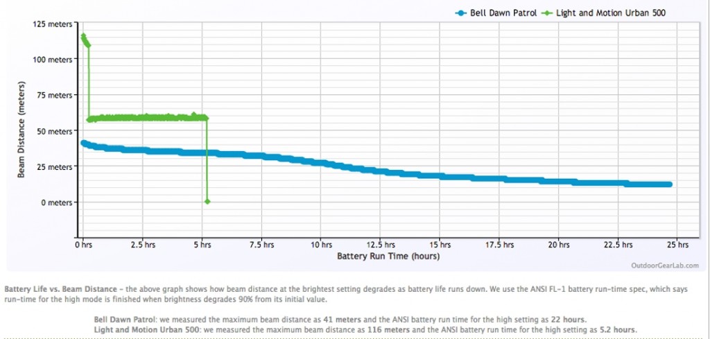 Compared to other lights in the $10-20 range, the Dawn Patrol is reasonably bright if you measure its output in the center of the beam. Our tests show its maximum beam distance to be 38 meters, much better than some of the other cheap lights that only shined 2-10 meters. However, the concentrated beam reduces overall brightness because very little light reaches the places where our testers want it: down low in front of you and to the sides. We give the light a 1 here, the lowest possible score in this category. Compare that to the Metro 400 which shined 135 meters and is quite useful.