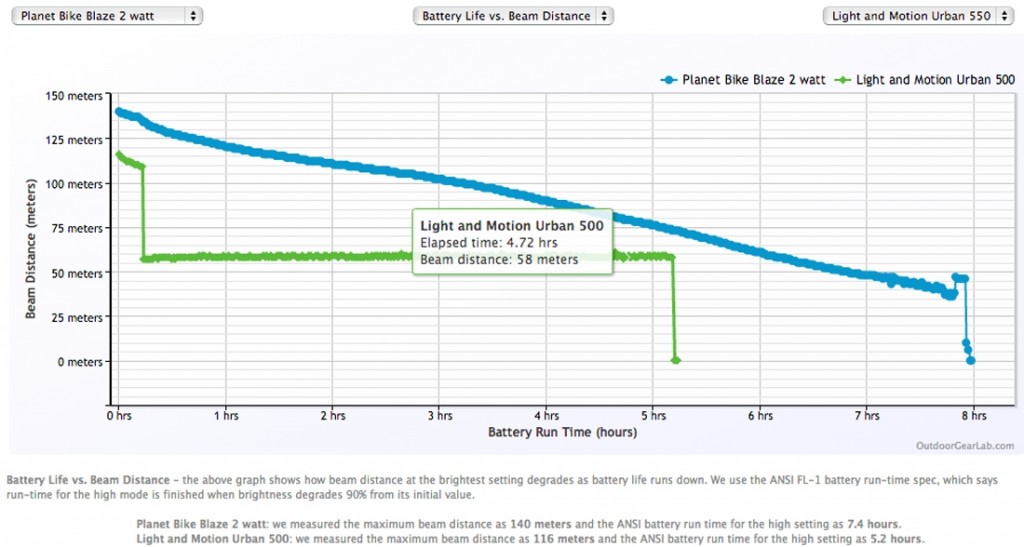 This light scores relatively low in brightness. We measured its maximum beam distance to be 490 ft, which is above average. However, other bike lights reach as far as 573 ft. Below, see how the brightness and beam pattern of the Blaze 2 Watt stands against the Light and Motion Urban 550.