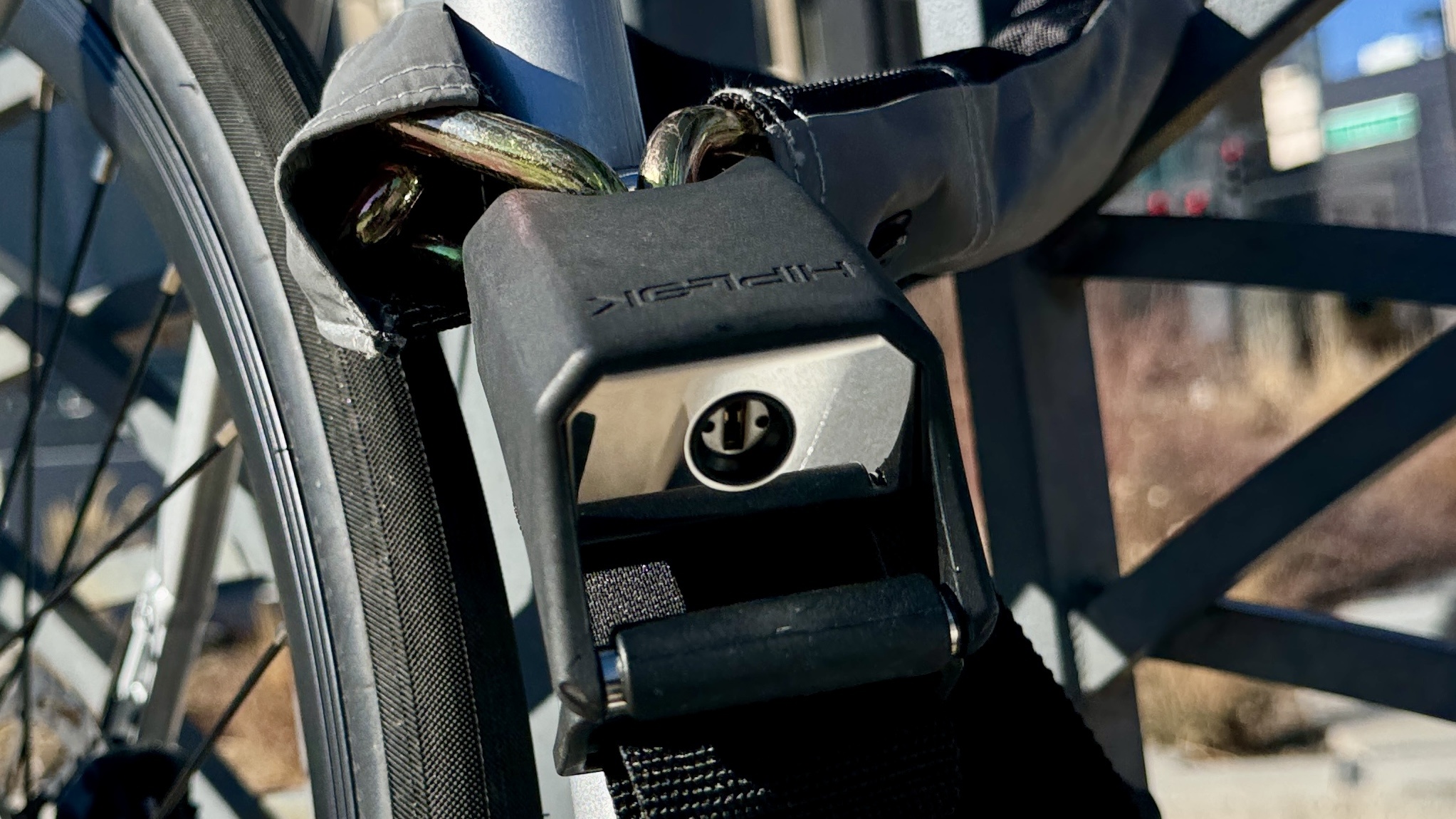 Judging Hiplok's versatility is a bit of a mixed bag. On a standard frame, the chain is long enough to secure the frame and one wheel. To lock both wheels, you'll have to pop off the front wheel and place it next to the rear. While that's an extra step, the chain's flexibility makes it far better at handling mountain bikes with high-volume tires or ebikes with swollen downtubes than many rigid U-locks or folding models.