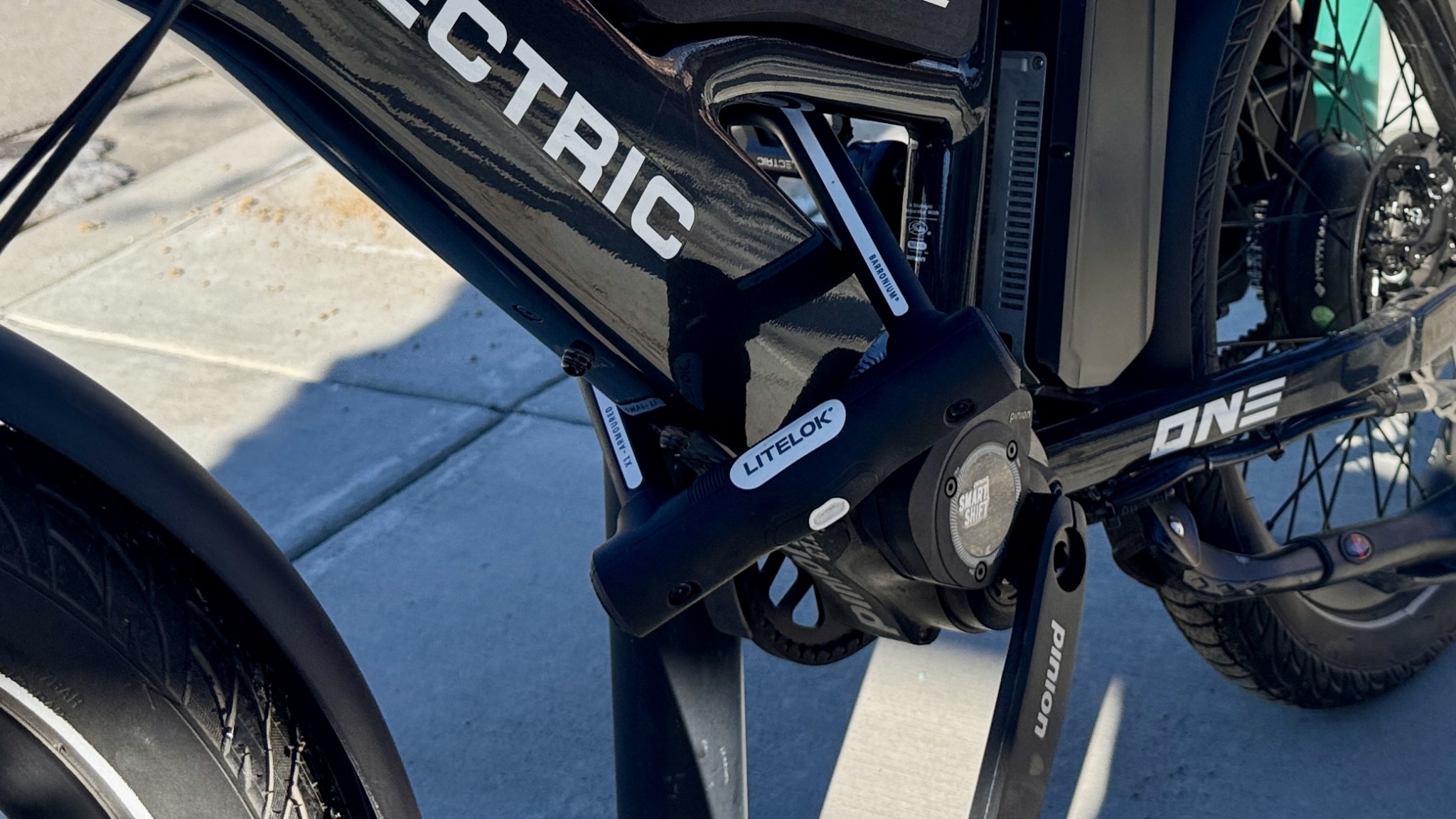 The Litelok X1 is a bit of a specialist, and its rigid dimensions limit where it can go. We struggled to fit it around oversized tires or some ebike downtubes. The interior of the lock measures 4 x 7.5", and while the shackle fits most standard bike racks, you don't have the versatility to lock to non-bike-rack-shaped objects.