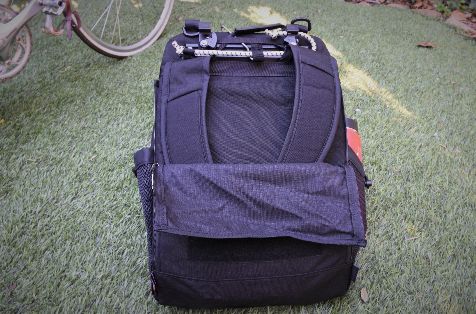 The backpack straps of the Bug Pack are easily engaged by moving the lower attachment hook up near the upper hooks so it's out of the way, and unzipping the back panel to reveal the backpack straps. The back panel conveniently rolls up and is easily stowed out of the way with some strategically placed velcro patches. To convert from backpack mode back to cycling mode, simply unroll the back panel and zip it back up while stowing away the backpack straps, and move the lower attachment hook back towards the bottom of the bag.