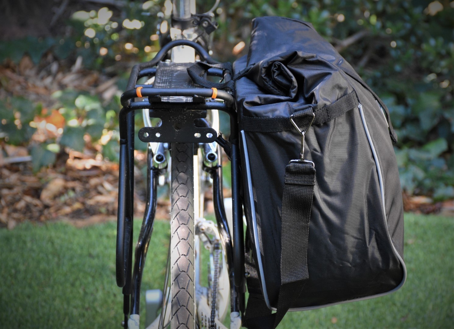 With its very simple design, the Waterproof Pannier is certainly easy to use but has a few key areas where user-friendliness could be improved. While the main mounting hooks are easy to use, the lower triangular mounting hook is very difficult to feed through the adjacent support strap, reducing its usefulness. And while we appreciate the included shoulder strap, it is not adjustable for ultimate carrying comfort. We do, however, appreciate the reflective trim that is visible from every angle.