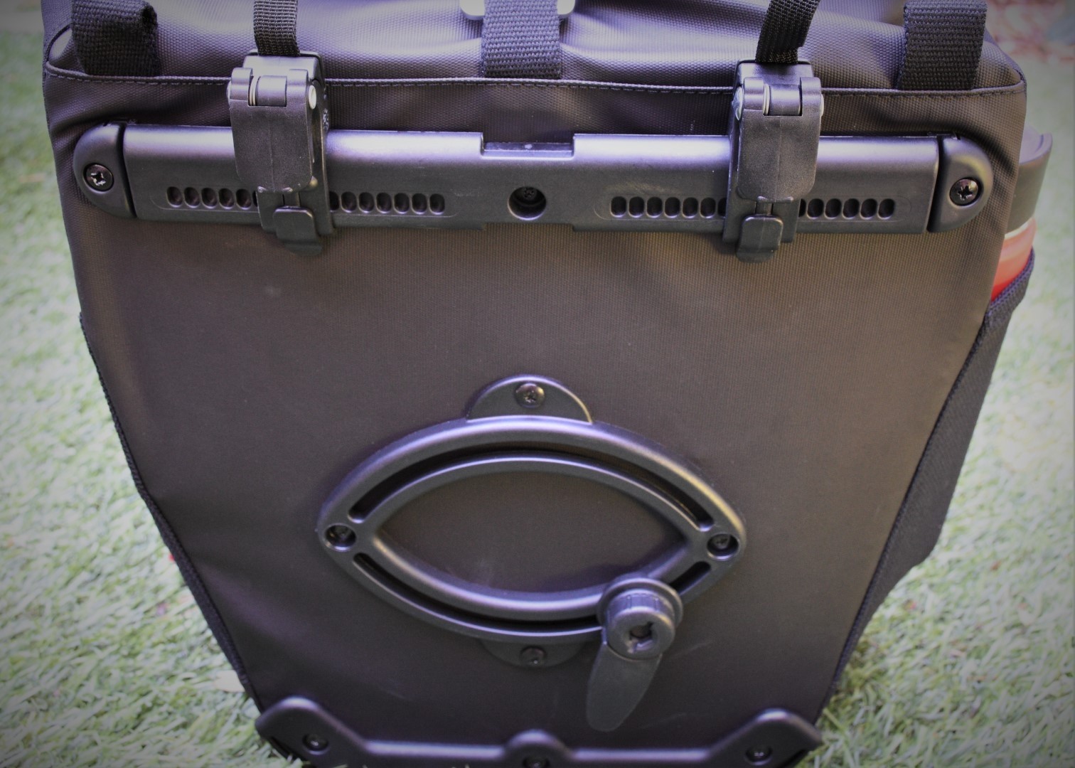 The Suffolk Rear Pannier has a hook-and-latch style mounting system that is typically found on touring panniers. The handle you use to lift the pannier off the rack will release the latches when you grasp it, allowing for effortless loading and unloading. This mounting system also has quite a bit of adjustability, where the upper hooks can slide along a track, and the lower hook can slide and rotate. This provides a very secure attachment, even on bumpy terrain.