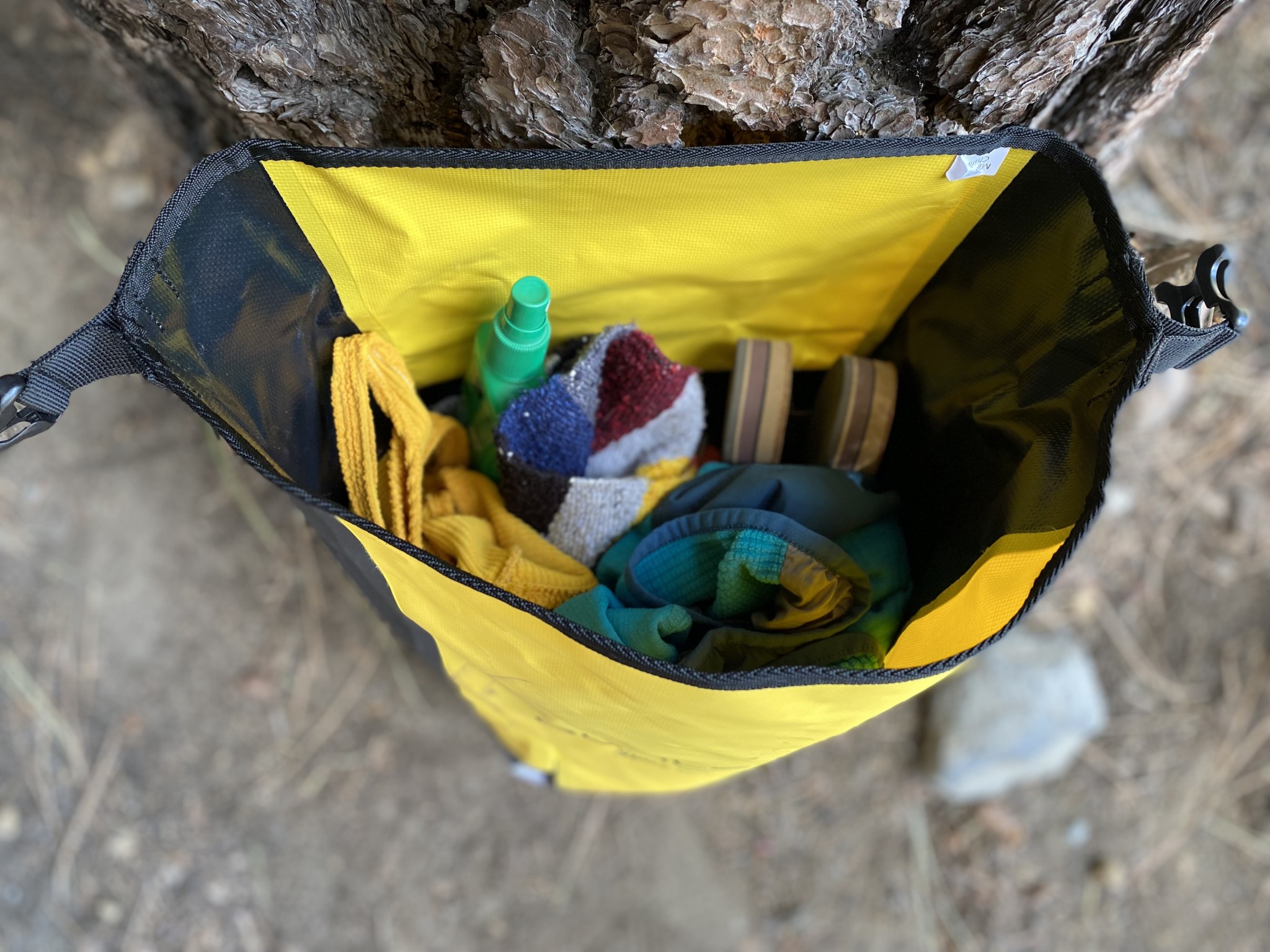 The Burley Pannier Set boasts a 500-Denier waterproof tarpaulin with heat-sealed seams and a roll-top closure. Tarpaulin is a heavy-duty polyester canvas coated with PVC. This thick, high-strength material is very difficult to rip or tear and is highly waterproof and stain-resistant. Despite the tarpaulin's hefty nature, the panniers are rather lightweight. The Burley set passed all the toss tests during our gravel rides, proving to be seemingly indestructible, though small scratches and dirt are more obvious on these bags thanks to the bright yellow colorway.