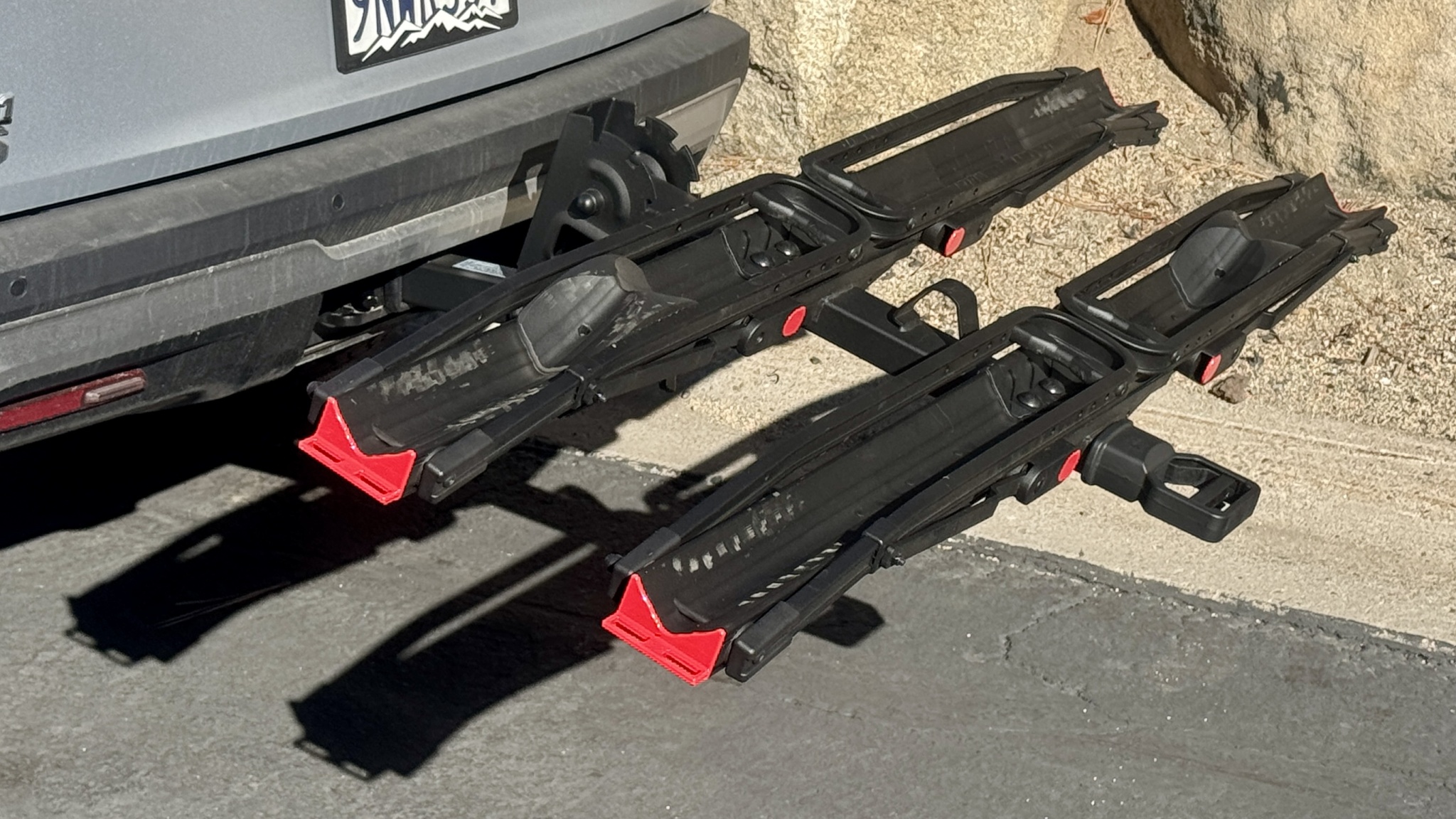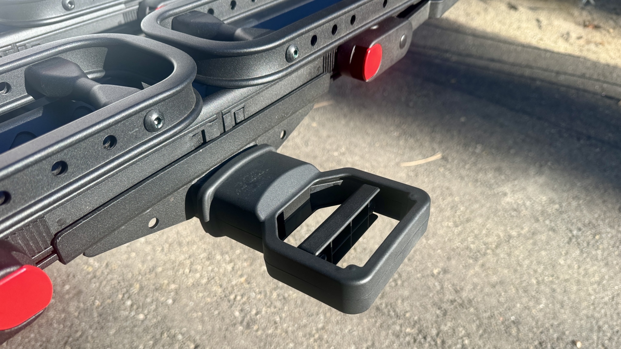 Installing the CrossTrack is fairly basic, and the wheel trays give you well-balanced handles for lining the rack up with your receiver. Once inserted into your vehicle, you simply install the locking hitch pin and twist the No-wobble bolt to secure the rack within the hitch. The No-wobble bolt works by pulling the rack against the locking hitch pin, it doesn't expand inside of the receiver like other anti-wobble racks. When you tighten the No-wobble bolt, the exposed end of the bolt protrudes from the back of the rack itself, like you can see in the photo above. On our test vehicles, this resulted in a bolt that stuck out between 2 and 2.5 inches. If you're anything like me or our testers, you're going to kick this with your shin or poke yourself in the leg while installing or removing the rack.