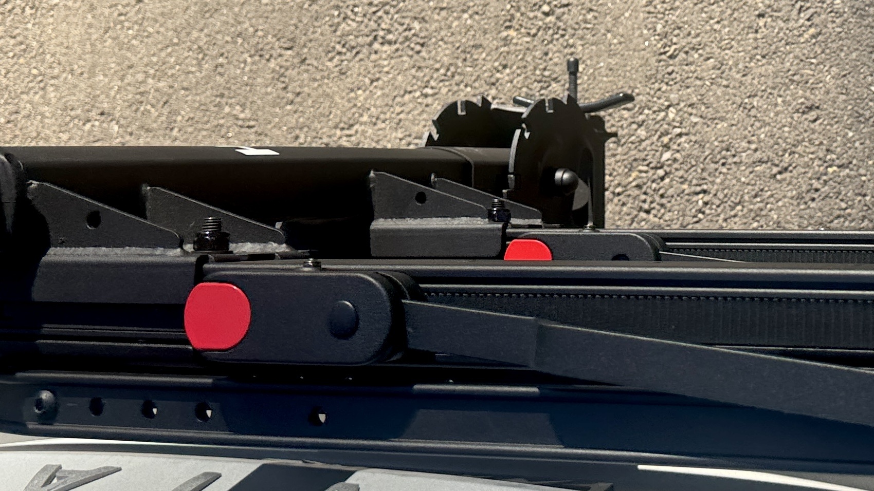 Unloading the rack is a bit easier. You start by pressing the red button for the wheel arm on the rear of the bike. Depending on how tight the bike is being held, the button can be extremely hard to press and uncomfortable to your thumb. Once depressed, you use your other hand to push the wheel arm out of the way while holding the button down. Then, while supporting the bike with one hand, depress the red button for the front wheel and push the wheel arm out of the way. I know that sounds like jobs for three hands, but you figure it out. Once the tire arms are free of the wheels, the bike can be lifted off the rack. To fold the rack up, you collapse the wheel arms inward, which can be done with one hand, and fold the rack toward your vehicle using the front pull handle, which can also be done with one hand. The red release buttons are easy to use and don't pinch your fingers like we sometimes experience with the 1Up-USA racks, but this isn't nearly as easy as using the Kuat Piston Pro with pneumatic arms that unfold for you.