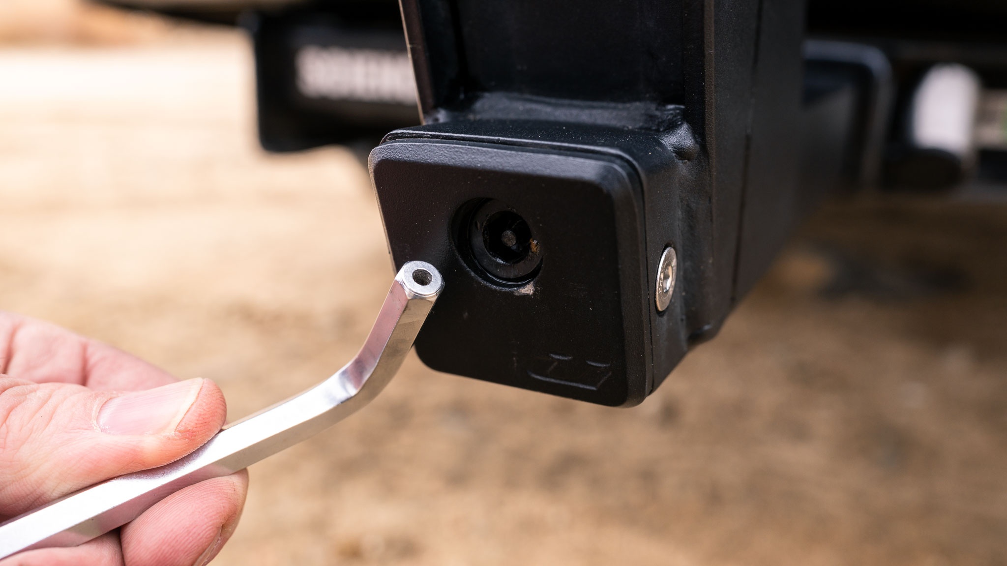 To remove the Piston Pro from the vehicle, you start by unlocking the stainless steel hitch pin lock and sliding the hitch pin out of the receiver. Next, you use the specially provided 8mm security key to open the FlatLock cam that tightens to prevent the rack from wobbling. You'll need to be responsible for the security key as it doesn't lock into the rack as it does on the Piston Pro X. Led lights are absent on this model, so you needn't plug the rack into your hitch connection.