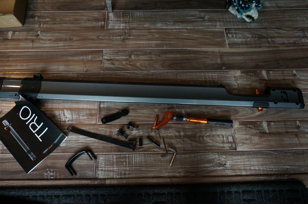 The Trio arrived mostly assembled right out of the box. You will need to select the correct axle adaptor for the bike you'll be mounting and slide it into the tube on the tray, tightening the fixing bolt by using the skewer tube wrench (it is a 4mm Allen key).