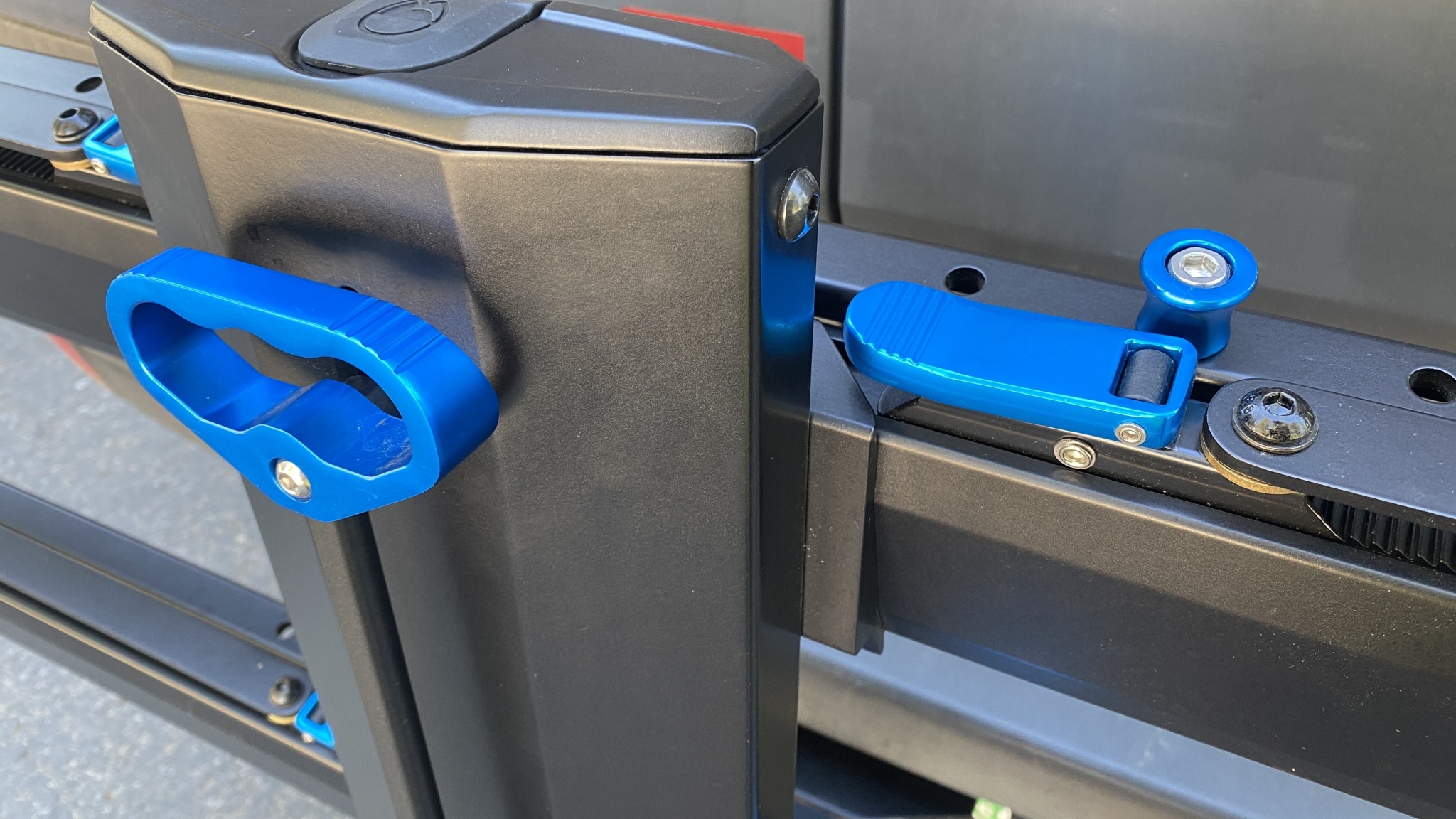 One of the things we liked about the GuideRail was the tilt release handle. This handle is prominently located on the outside of the rack when it's in folded position. A quick pull of the blue handle lets you move the rack from its stored position to flat/load position to downward tilt. The downward tilt allowed us access to the hatchbacks we tested with, but even the empty rack prevented us from using the rear doors on our vans. In general, this rack isn't recommended for vans as it also holds bikes too close to the rear of the vehicle; we had interference issues with handlebars as narrow as 760mm. There were no issues with its use on trucks, but as with all bike racks, be mindful of where your tailpipe exhausts, as the heat can damage your bicycle.