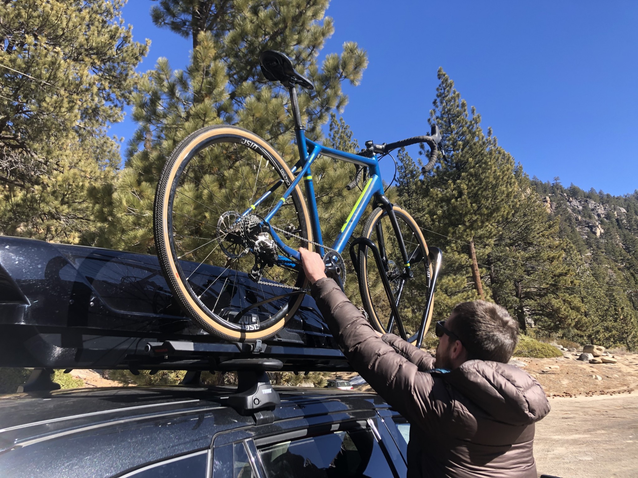 In some ways, this design is more user-friendly than fork-mount roof racks because you don't have to remove the front wheel or fiddle with adjusting the fork axle mount. At the same time, having the front wheel on the bike means you have to lift it slightly higher to load it. With the HighRoad, we found the bike hold to be very secure, plus it works well with a range of wheel sizes and tire widths.