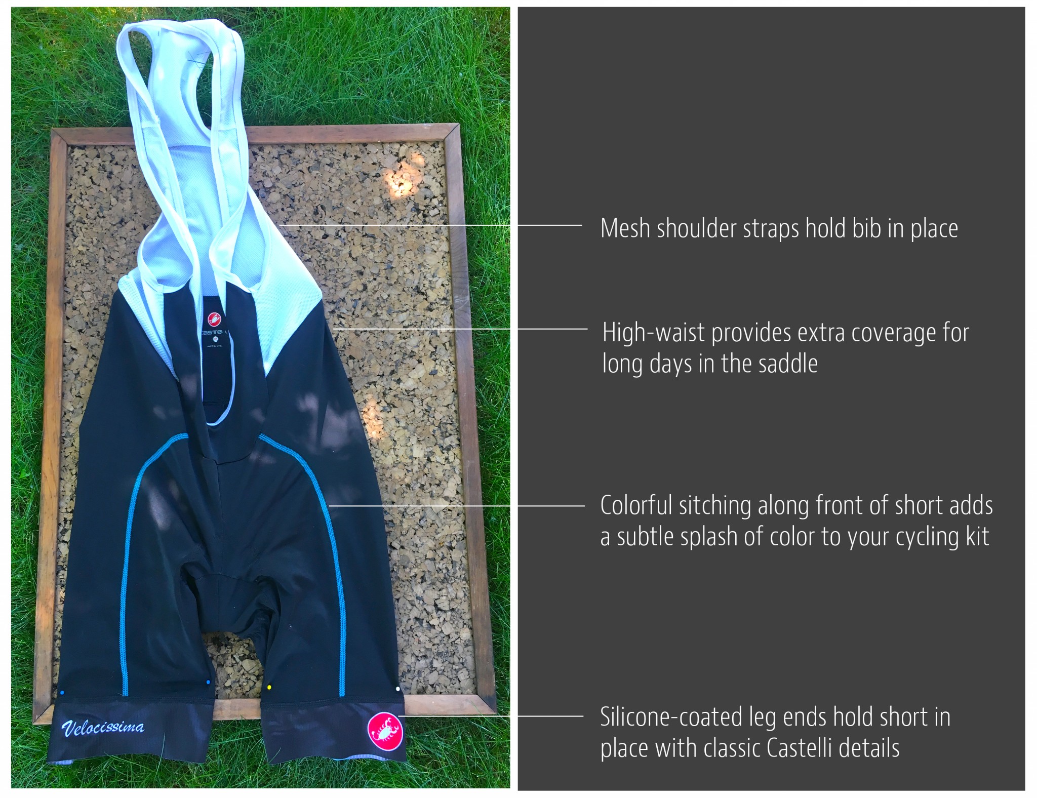 A discussion of the merits of wearing bibs versus shorts is probably in order, especially since the idea of bibs, to any new cyclist, probably sounds corny, or at least mildly distasteful (aren't bibs for babies or old people?). Keep the following in mind: bibs are not just regular shorts with added suspenders. While everyone has a personal preference for one over the other, here are some features of the Velocissima bib that you won't find in any short.