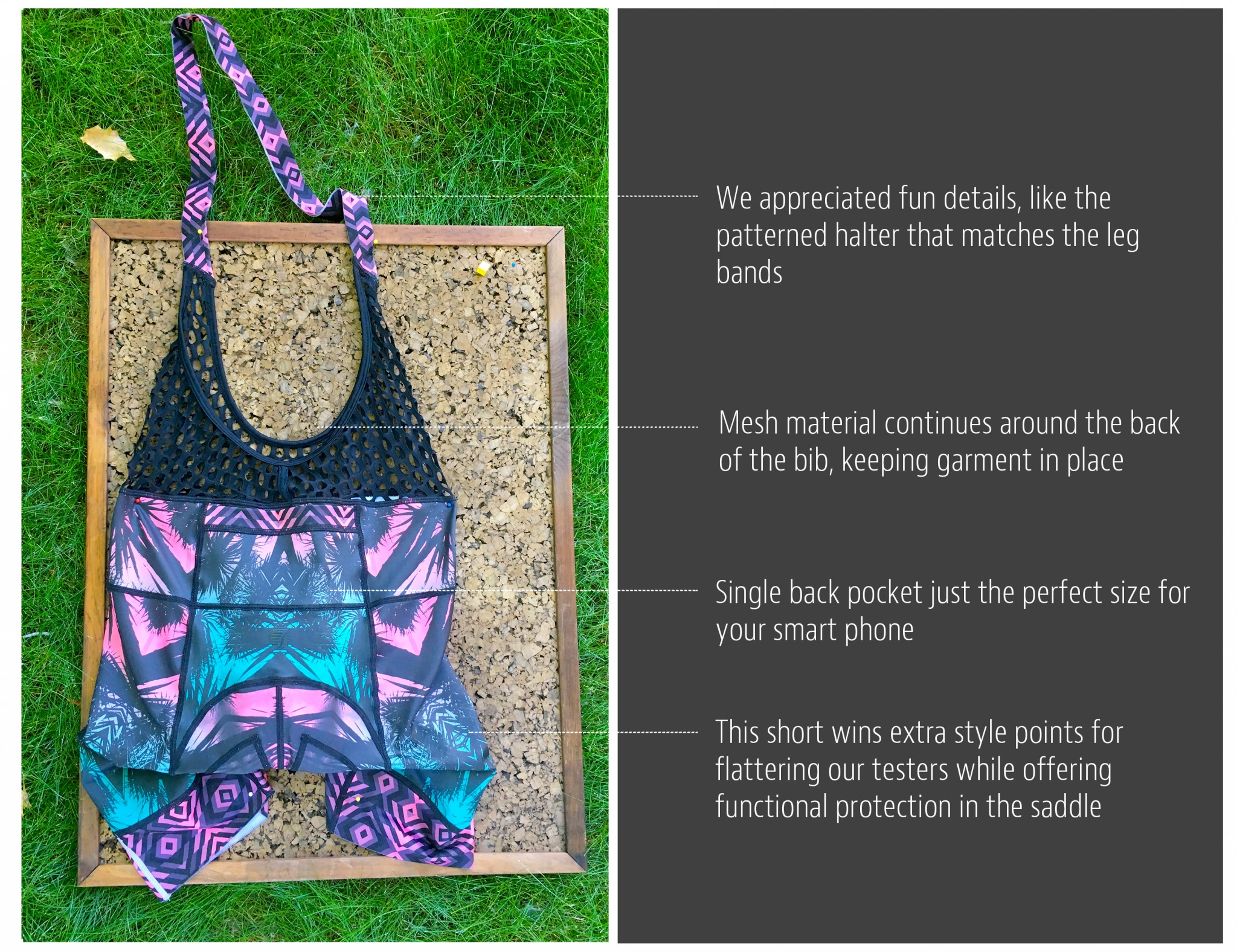 This bib gets a gold star when it comes to style. Granted, looks aren't everything, but really, they rarely hurt. Of all the shorts included in this review, the Petunia bib blows style out of the water, with options that include: hot pink kitten faces, psychedelic flowers, palm fronds, gingham plaid and a crossword puzzle (among others.) If expressing your unique style is just as important as comfort, this is definitely your short.