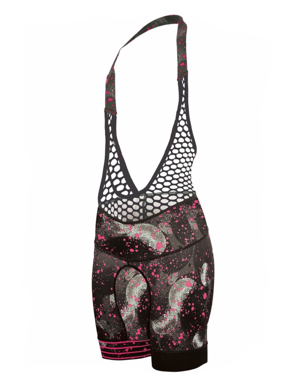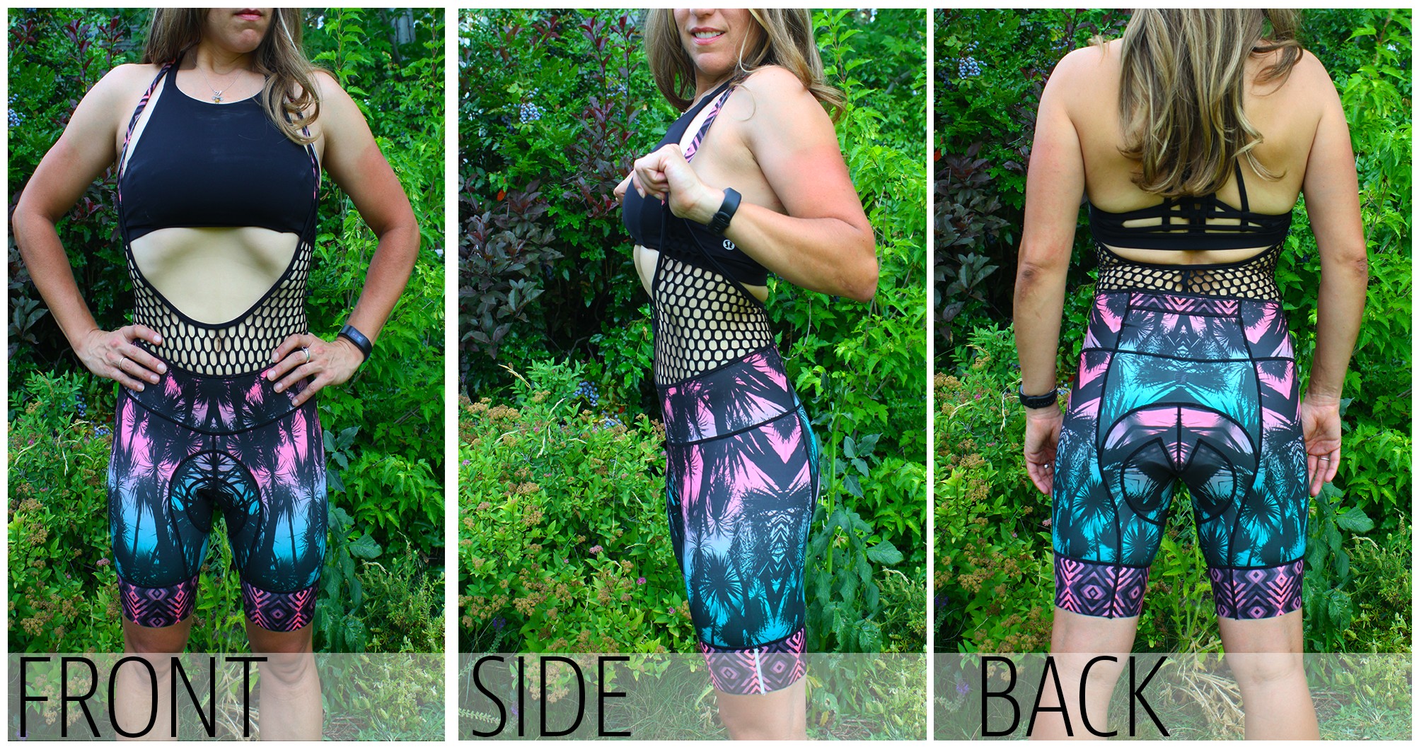 The Petunia Bib is unique in our line-up of the top women's cycling shorts. Most noticeably, it deviates from the “basic black” of the traditional cycling short, adding something unexpected: a psychedelic palm tree print with an accent of some trippy pink and purple diamond patterns. Other Shebeest patterns include a galactic motif with celestial bodies, a psychedelic kitten print and a forest scene at twilight.