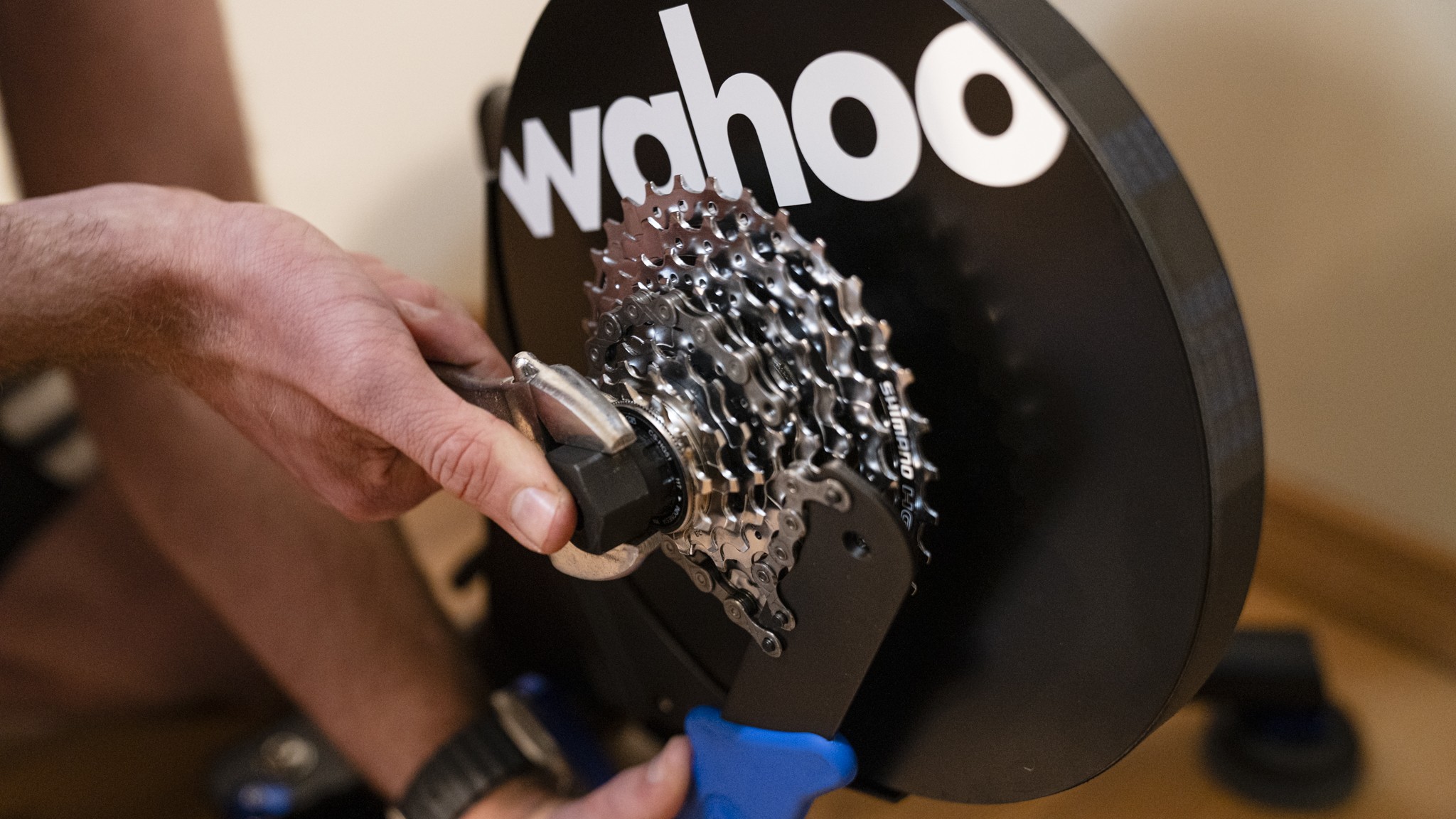 The Kickr requires minimal setup before you can start riding. Setup through the Wahoo app is fast and simple after the trainer is plugged in. If you don't have an 11-speed drivetrain, you'll need to swap that out as well. The legs easily fold out by pulling up on the blue lock pins and snapping into the open position. All that is required to get onto riding is placing your bike on the trainer, which is essentially the same process as putting a wheel on your bike. Depending on your axle setup, you may need to use an adapter before mounting the bike. The steps are simple and well-explained.