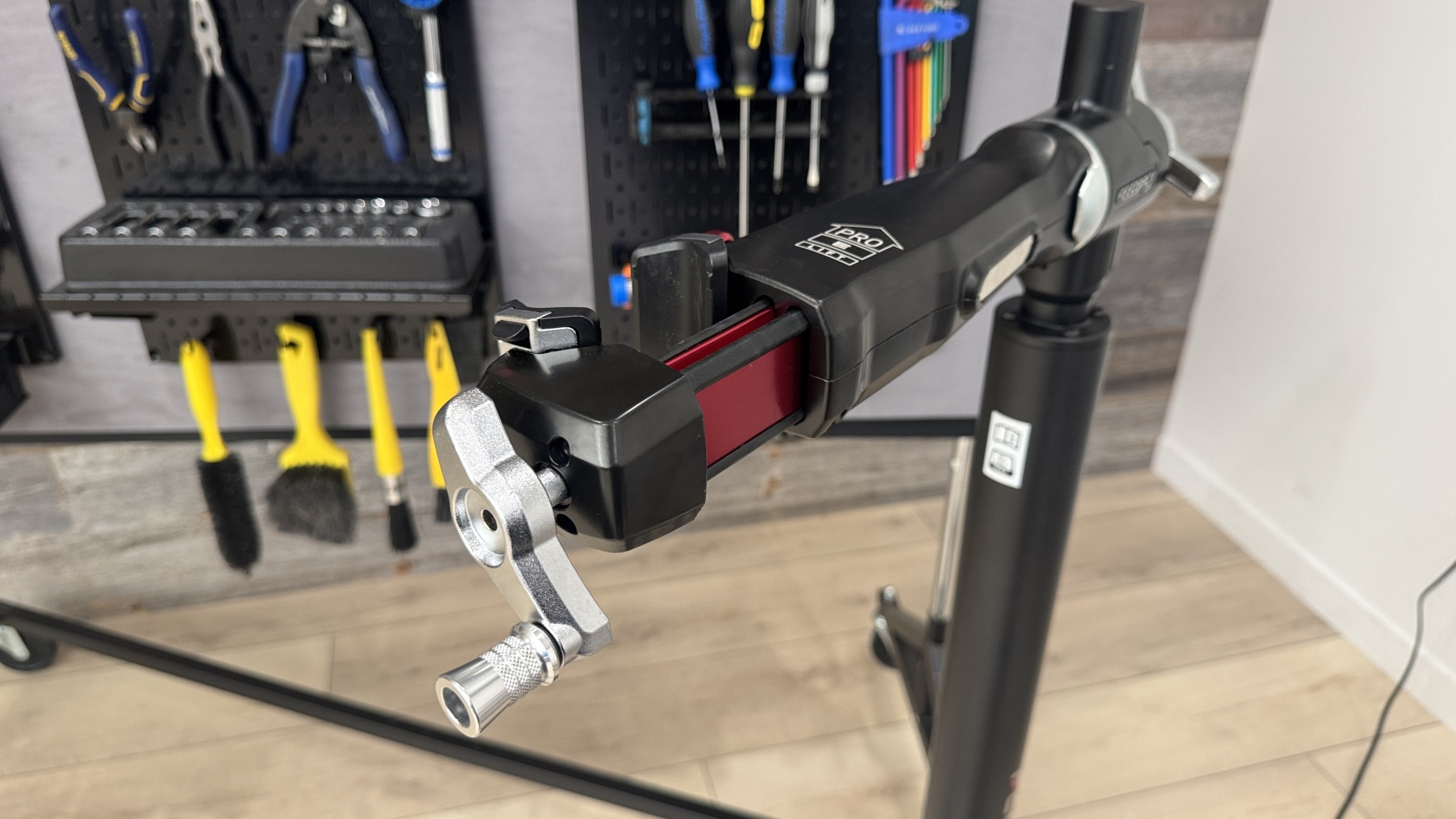 The base of the E-Lift Pro differs from most bike stands, which use an elevated tripod for stability. With its heavy motor on the floor, two legs extend outward from the back of the base, and two longer support legs extend diagonally beneath the bike work zone. The shape of the rear legs allows you to set the stand up against a wall, and also rock it back on the transport wheels to roll it around with ease. We've loved the versatility of the Pro HD repair stand, but despite being able to hold bikes up to 100 pounds, it's only stable if the bike's weight is directly centered over one of the legs. With the E-Lift Pro, the bike doesn't rotate around the Y-axis (vertical), so it never feels unstable or prone to tipping.