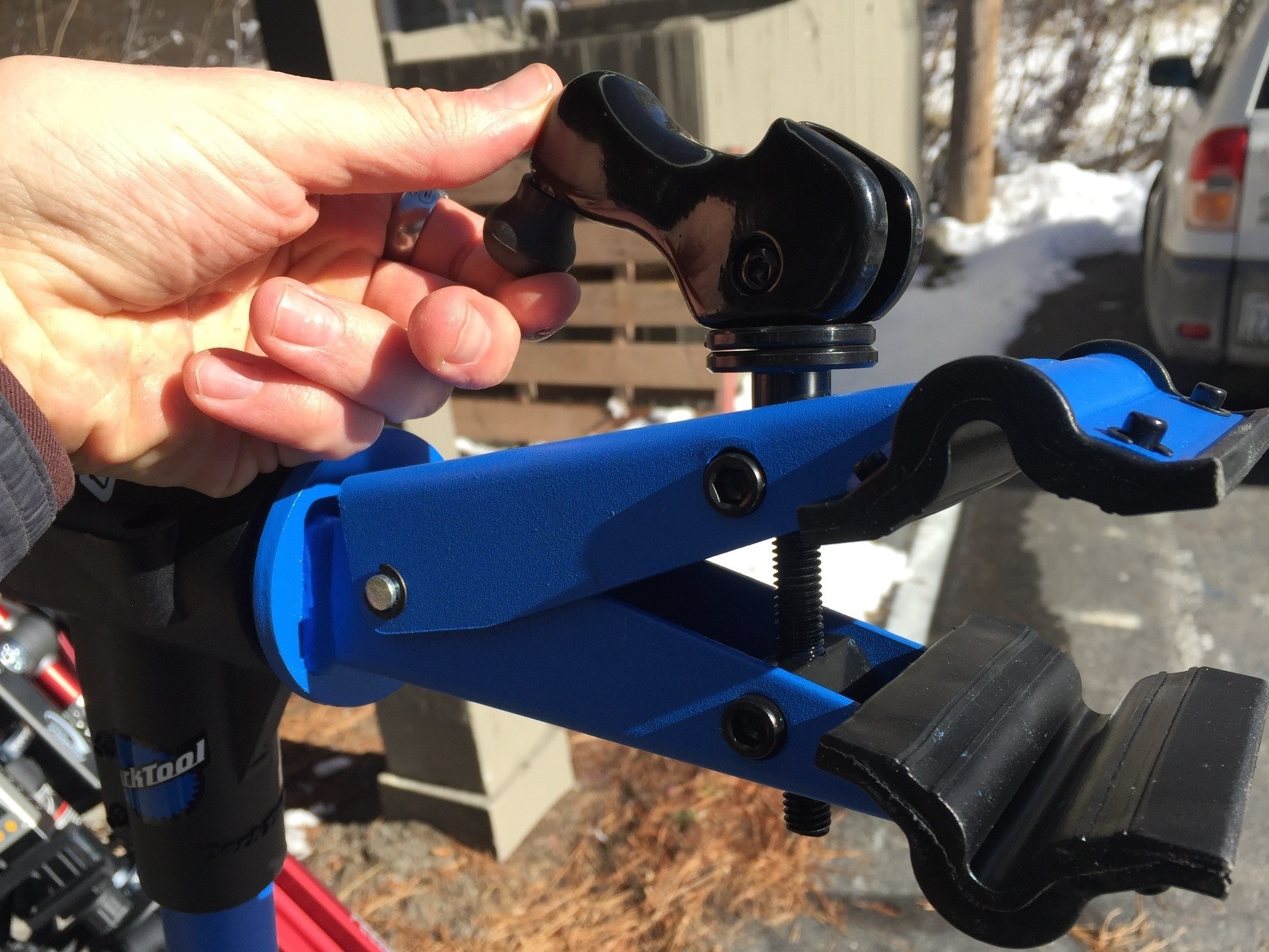 The PCS-10 features a full 360 degrees of clamp arm adjustment with a smooth non-indexed rotation. The angle adjustment is controlled by a large handle on the back of the clamp arm. Loosening this handle allows a compression cone to spin within the composite top tube of the stand to the desired position. We found this adjustment to be especially smooth and controllable on the PCS-10, as you can modulate the rate at which the clamp arm can spin with the tension you keep on the handle that controls it. Angle adjustments can be made with or without a bike in the clamp, although we found it easier to do with a bike on the stand, assuming you are supporting the weight of the bike when the handle is loosened.