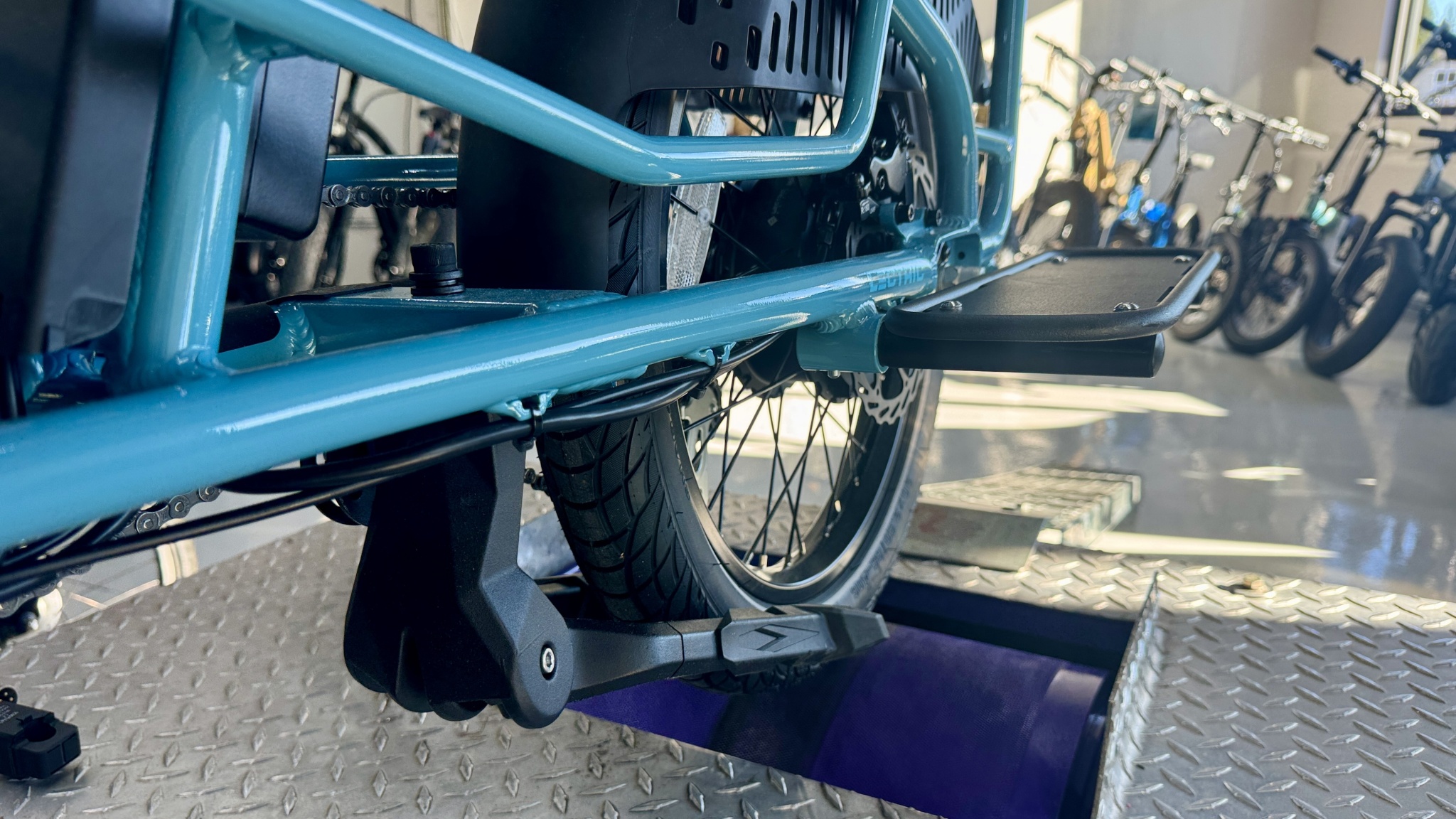 Lectric gets a lot of things right on this cargo hauler. By using smaller, 20" wheels, you don't have to worry about wheel flex when fully loaded, and they also make the bike easier to ride, park, and store. The XPedition 2.0 can carry riders up to 330 pounds while the rack can hold up to 300 pounds - but not simultaneously. The maximum load capacity of the bike is 450 pounds in total, with up to 30 pounds on the optional front rack. The 20" wheels also keep the bike's center of gravity and rack height low. The 15" wide, center-mount kickstand expands as it deploys; it's far more stable than the past model, and Lectric ostensibly placed it so far to the rear to create more stability when the rack is loaded. The downside to its placement is that it's a bit more difficult to get up and down, especially when using the running boards.