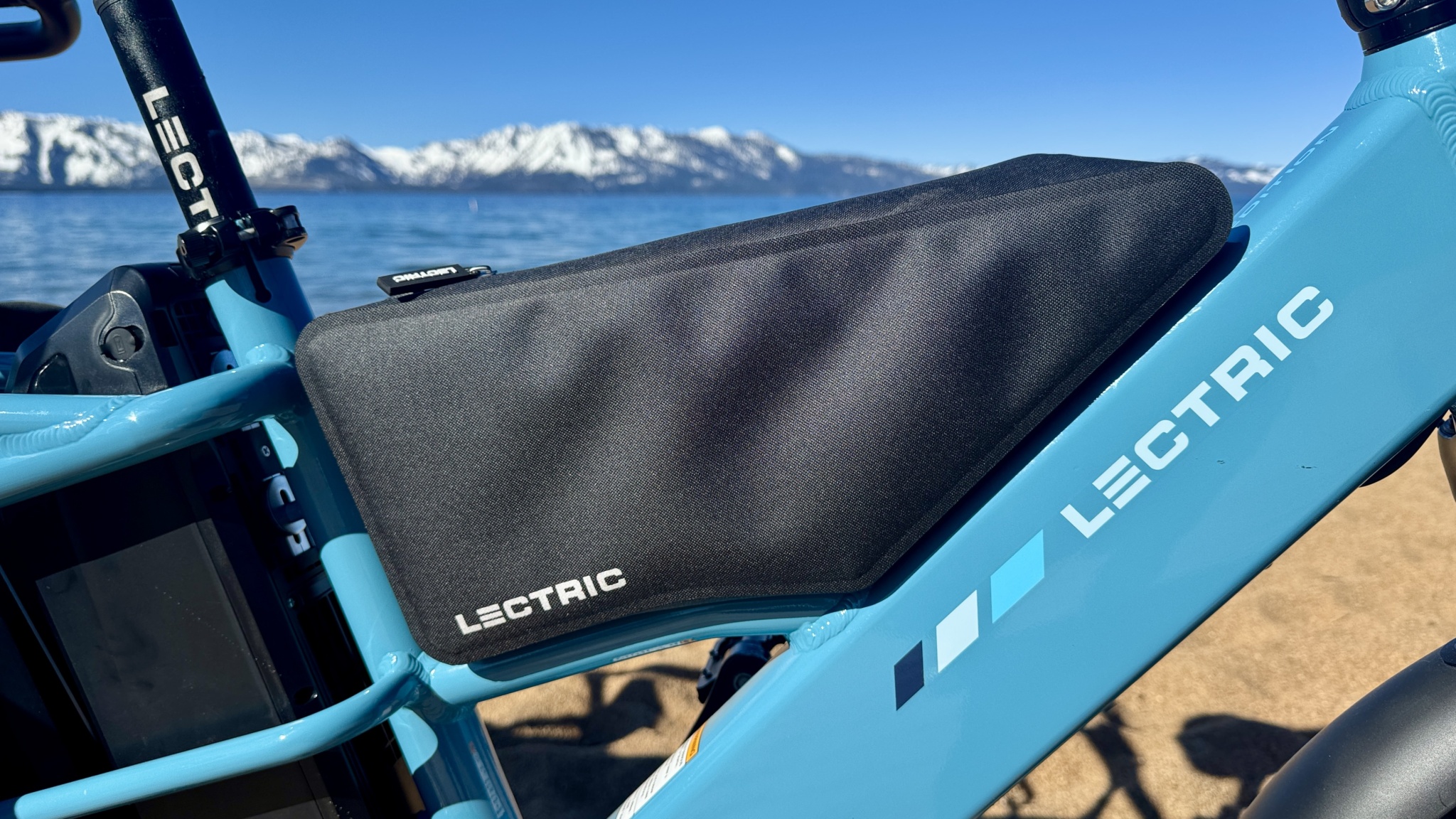 The bike has a 21" step-over height, making it user-friendly for people with shorter legs. When we purchased our bike, several “free items” were included. This is common for Lectric, and one of the things they included was a top tube bag. It's an incredibly handy accessory that makes stowing your gear, like a lock or phone, very simple. It also raises the step-over height by 6.5", so it's not likely a great accessory for smaller riders.
