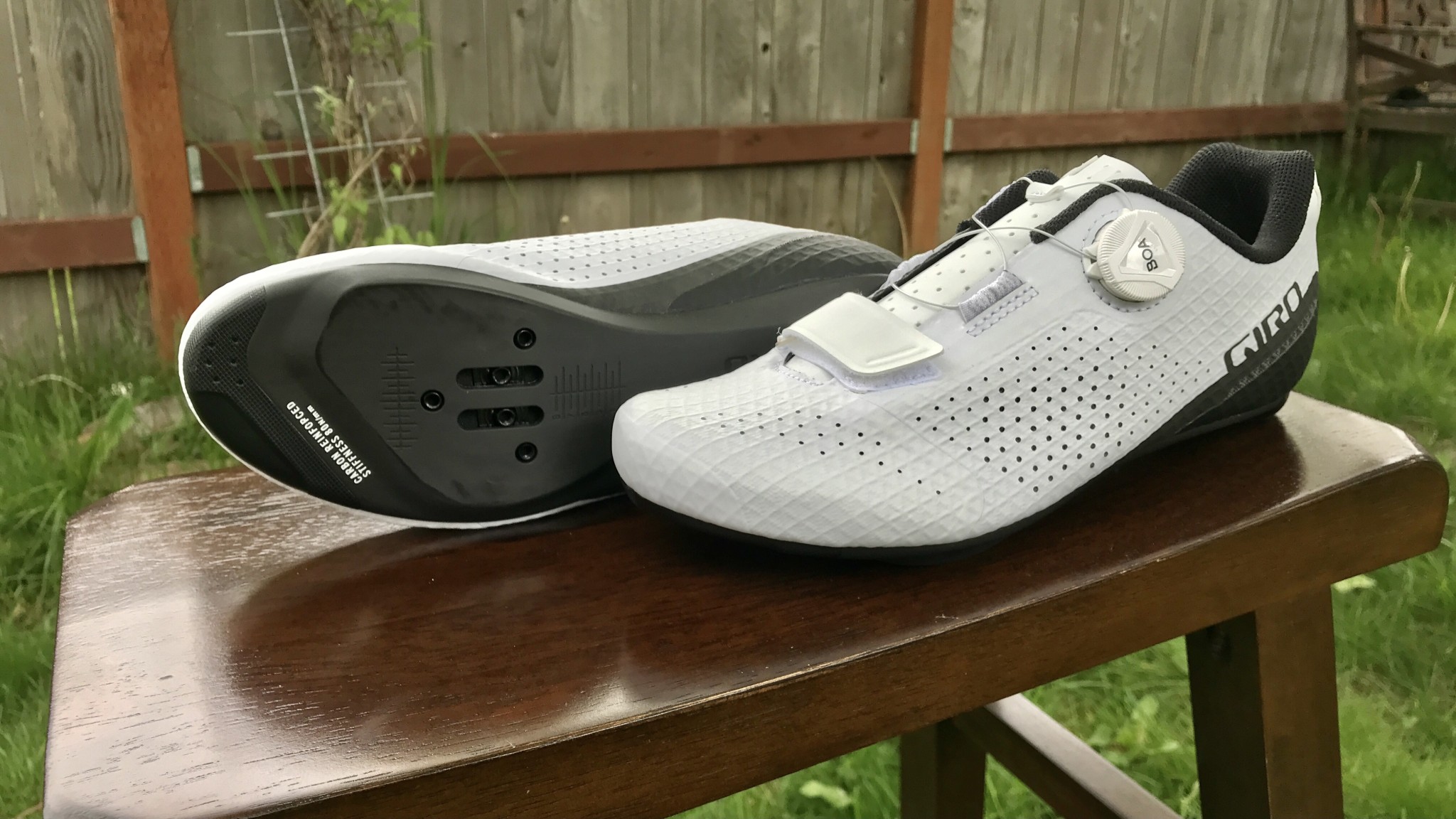 The upper is made from something Giro calls Synchwire, a sandwich of monofilament mesh, a non-woven internal sheet, and an outer TPU layer. The upper conforms nicely to your foot, doesn't seem to stretch during hard efforts, and affords decent ventilation. That ventilation is important, as the carbon-reinforced nylon outsole has no ventilation built in. The tongue is made from synthetic leather, which makes a creaking noise when it rubs on the backing of the Synchwire upper. We really only noticed this when putting the shoe on or taking it off, and fortunately, never while riding.