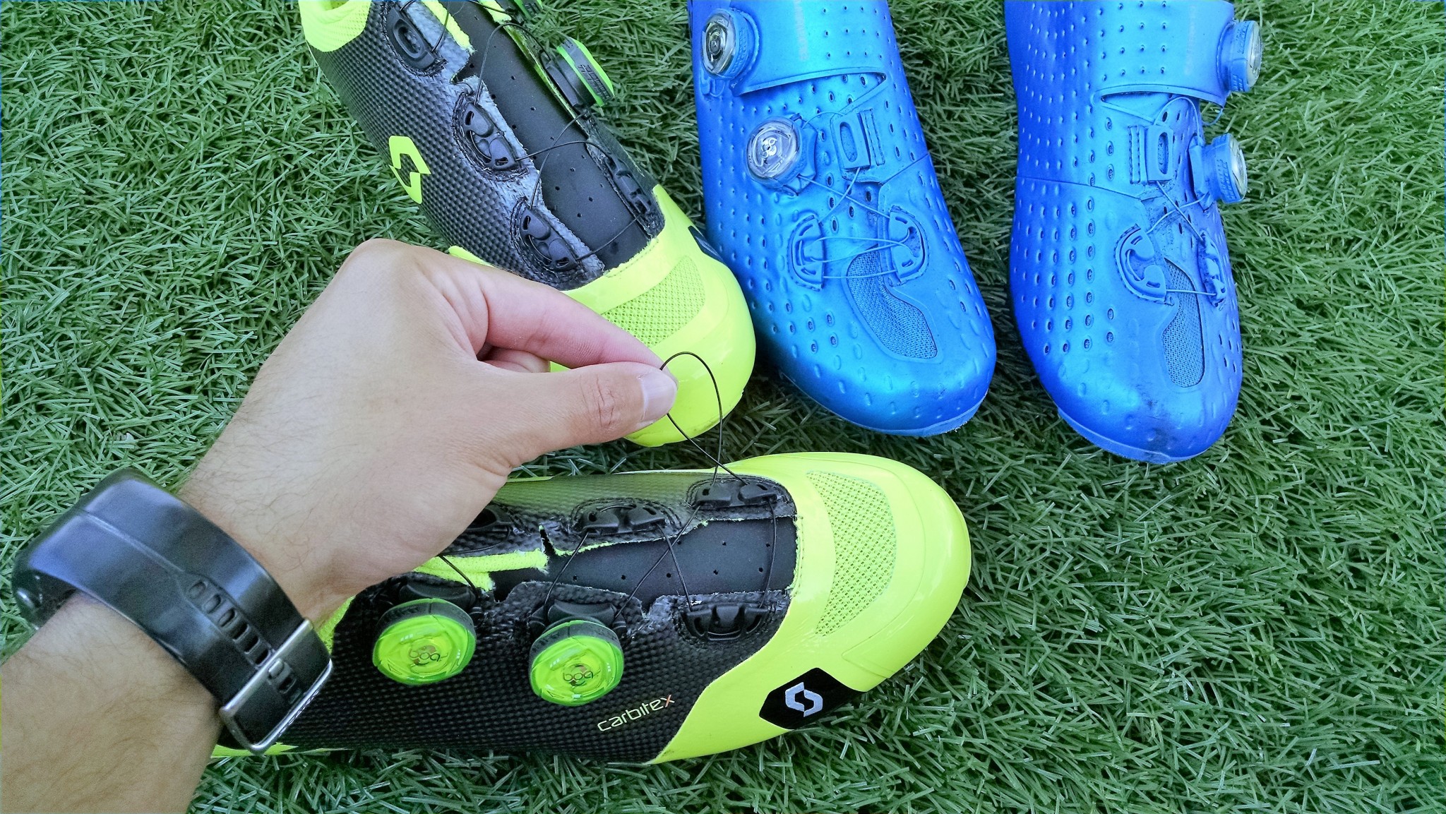 It's pretty hard to argue with the simple dual IP-1 Boa design. They're bi-directional and allow 1mm micro-adjustment in either direction, plus the quick release. They're placed along the upper side of the shoe, within easy reach if you need to adjust mid-ride. The lower dial also has a second set of anchors across the toes with a post that allows you to double cross the lacing for added tightness over the toes. Some of the other premium models like the Shimano S-Phyre use the same design.
