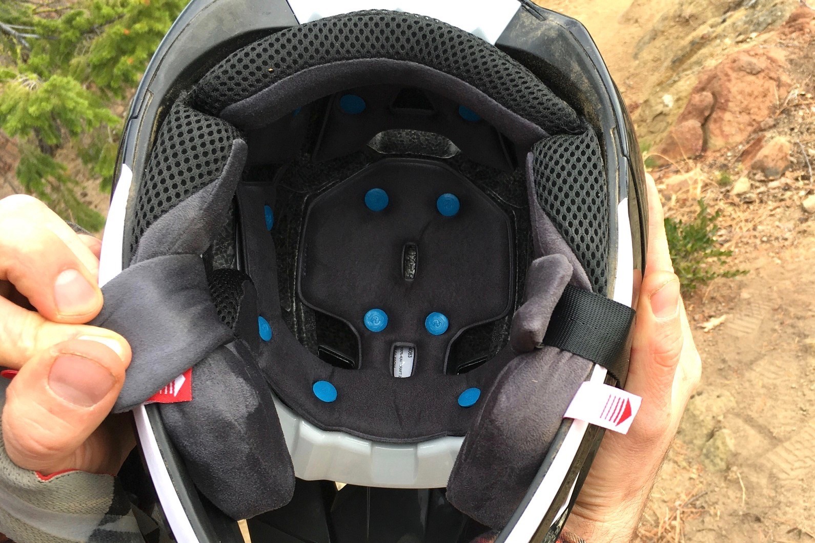 Inside the helmet, 100% has employed a 14-point SmartShock rotational protection system. SmartShock is a proprietary impact technology developed by 100%, and it is basically small rubber elastomers that suspend the helmet around the head and are intended to absorb both linear and rotational impact energy. This design is similar to Leatt's Turbine 360 and some other rotational impact protection systems on the market. You might be more familiar with Mips, or the Multi-directional Impact Protection System. SmartShock is a different approach to the same theory. When the helmet is on the head, the SmartShock pods go virtually unnoticed. When you grab the helmet and try to rotate it on your head, the SmartShock doesn't rotate quite as freely compared to a Mips layer. We can only speculate on the actual effectiveness of this or any rotational impact protection system. Regardless, we think features like this are better than none.
