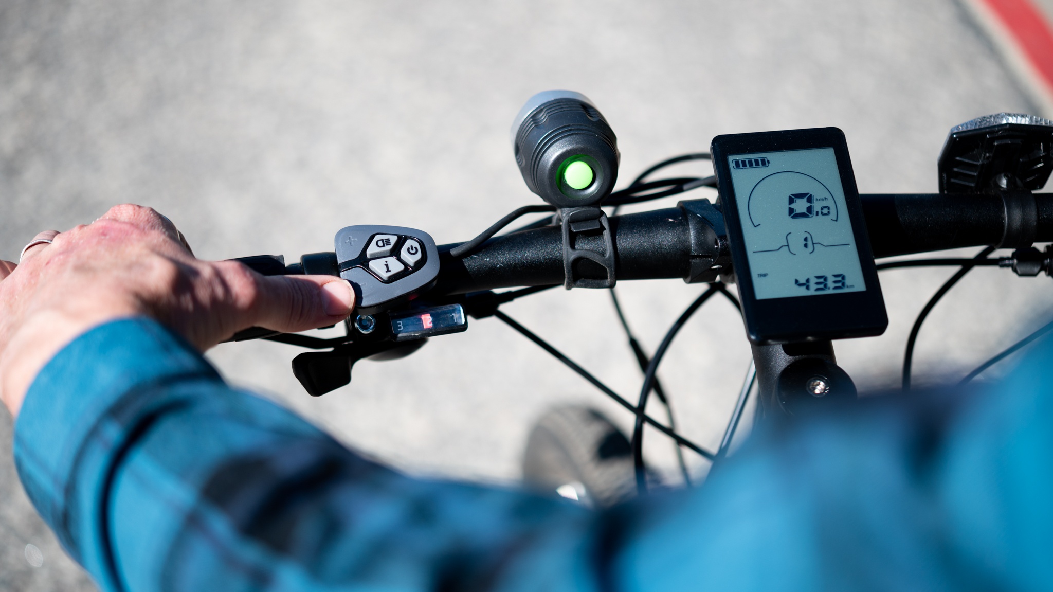 The Blue Spark has a great digital display mounted in the center of the handlebar above the stem. This location makes it especially easy to see while riding, and it displays a wealth of information at a glance. It shows current speed, remaining battery life, pedal-assist setting. By pressing the info button on the controls, you can choose what the bottom field shows (average speed, max speed, trip distance, odometer, or elapsed time). The screen also has a backlight that you can use at night or in challenging lighting conditions. It also has a headlight that helps in these scenarios. While we loved the display on this bike, we were quite dismayed by the fact that it didn't come with any instructions. We are sure that you can change the settings, but we couldn't figure out how for the life of us, and we were stuck viewing our speed and distance in kilometers instead of miles. Trial and error and internet searches left us scratching our heads.