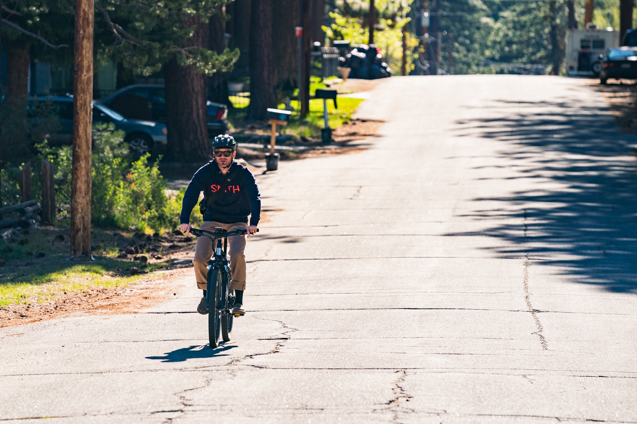 The Level rides just like a normal bike; we mean that as a compliment. Its handling is very natural and responsive, making a variety of turn shapes well. We found it very stable at speed, even when cruising along at 28 mph or bombing down steeper hills. The 27.5-inch wheels are fast-rolling, and the higher volume 2.2-inch wide tires help to dampen the ride and take the edge off cracks or bumps in the road. A Suntour suspension fork provides 75mm of front wheel travel,, which helps take the edge off bigger bumps or the unexpected pothole. The Bengal Ares 3 hydraulic disc brakes are quite powerful and have no problem slowing or stopping this heavyweight bike in a hurry. The parts and details seem to be thoughtfully chosen, down to the alloy platform pedals and the Shimano Acera 8-speed drivetrain. Overall, the bike also has a very solid feel, and it seems well put together with quality parts, and there are virtually no noises or rattling coming from anywhere.