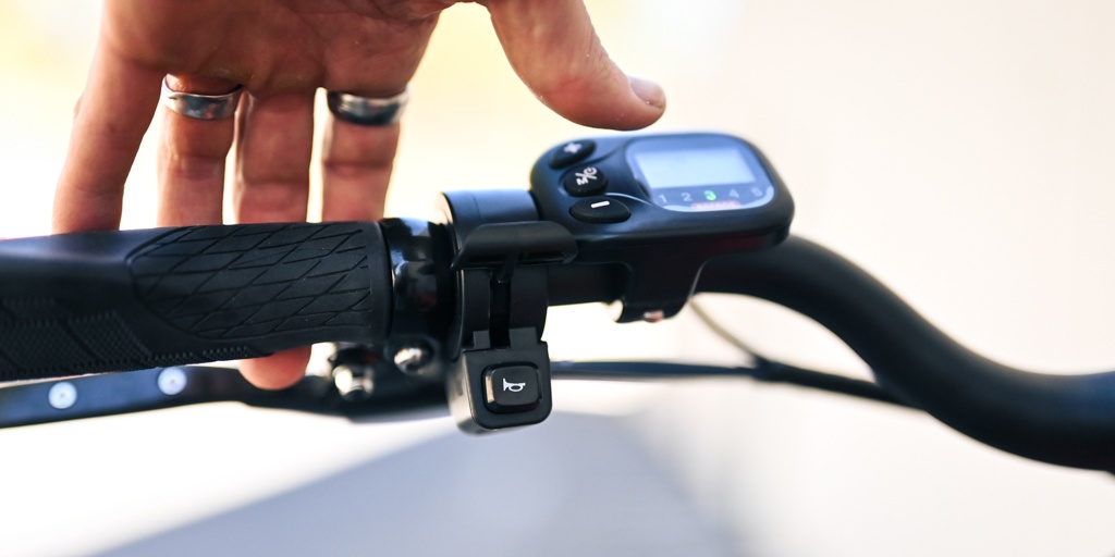 A paddle throttle is located next to the left grip, nearly identical to those found on many of the other models we tested. The paddle is easy to reach and press with the thumb, although it doesn't like to start using the throttle from a complete stop. Below the throttle paddle is a small button that actuates the integrated horn. Next to the paddle is a combo control/display unit with three buttons on its left side. The + and - buttons shift up or down through the pedal assist levels, while the power/mode button turns the bike on and off and switches between trip miles and total odometer on the screen. The position of these buttons makes them fairly easy to reach with the thumb while riding; there are no real complaints there. The screen is small; we measured it as 1 1/8 inches wide x 5/8 inches tall. It shows your current speed in fairly large numbers, with the battery charge shown as both a graphic and a percentage on the right side of the screen, with a tip distance/odometer across the bottom. Below the screen are the numbers 1-5 that show your current pedal assist setting. Again, this system works just fine; it just feels a little budget when compared to most of the other models we tested.