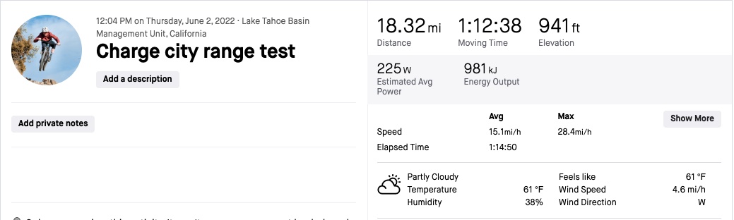 On our standardized range test course using the throttle only, the 418Wh of battery carried us 18.3 miles with 941 feet of elevation gain/loss. The test took a little over an hour and 12 minutes to complete, giving us an average speed of 15.1 mph. Now, 18 miles without pedaling is no small potatoes, but it's a far cry from the top-rated models in this metric (most of which have much larger batteries). On perfectly flat terrain, we think it's safe to assume you could squeeze out another couple of miles under full electric/throttle power, and clearly one could extend the range significantly with pedal assist and some input from the rider. Charge claims a range of 50 miles for the City, and while we don't doubt that's possible, we think it would involve some serious pedaling effort on the rider's part.