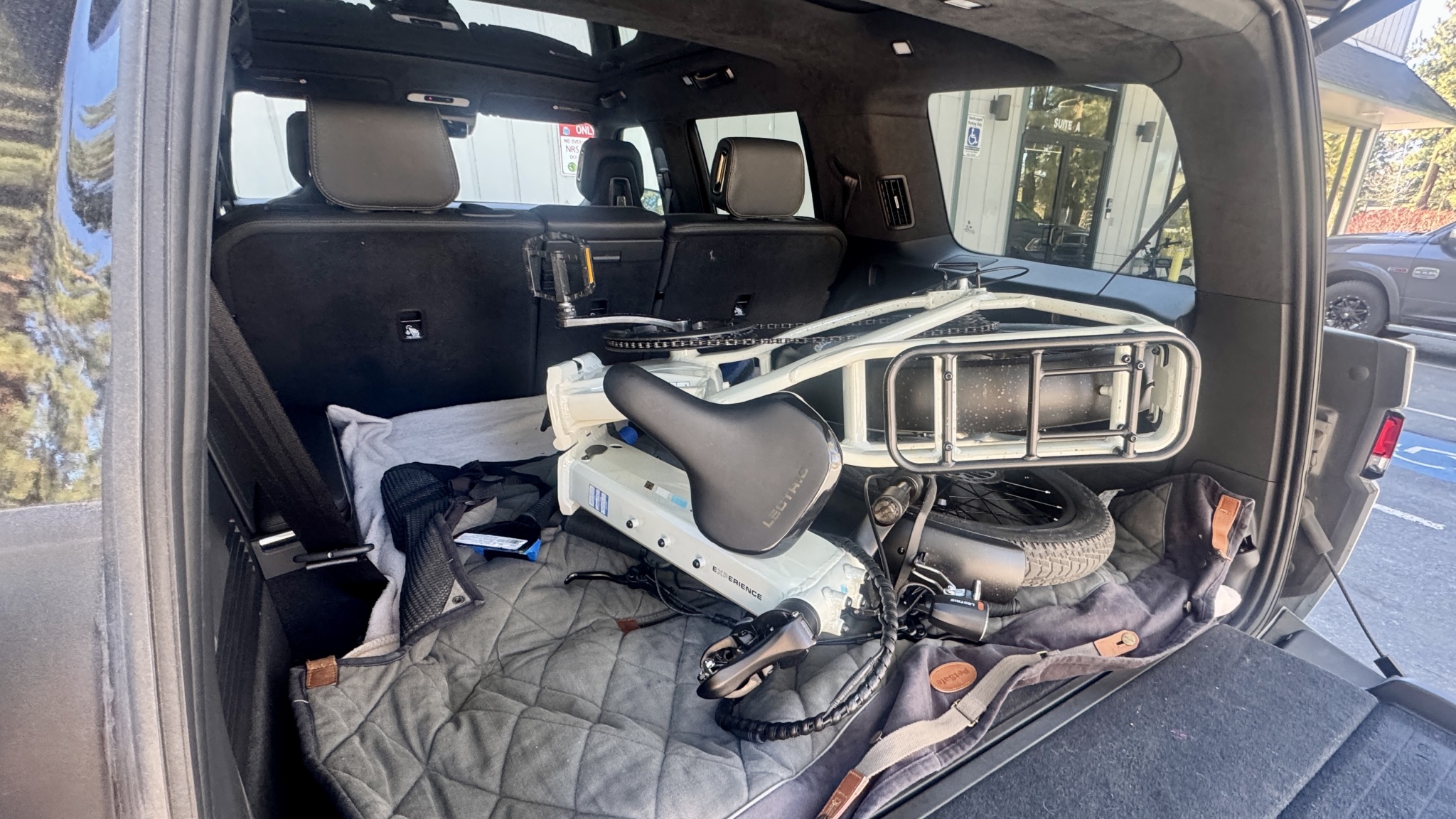 You can choose from two frame options when ordering: a step-through or a step-over design. Our test bike is the step-through version that lets you climb aboard by stepping over the 19" high frame. The step-over frame isn't much higher, at 24", but it's interestingly a totally different frame design that foregoes chainstays for super-wide seatstays. Both bikes have a built-in handle that can be used to carry them up stairs or to load them in a vehicle once folded. A slick “Level-Up rack” on the back of the bike can accommodate pannier bags, a rack-top basket, or even a seat that lets you carry a child or passenger up to 150 pounds.