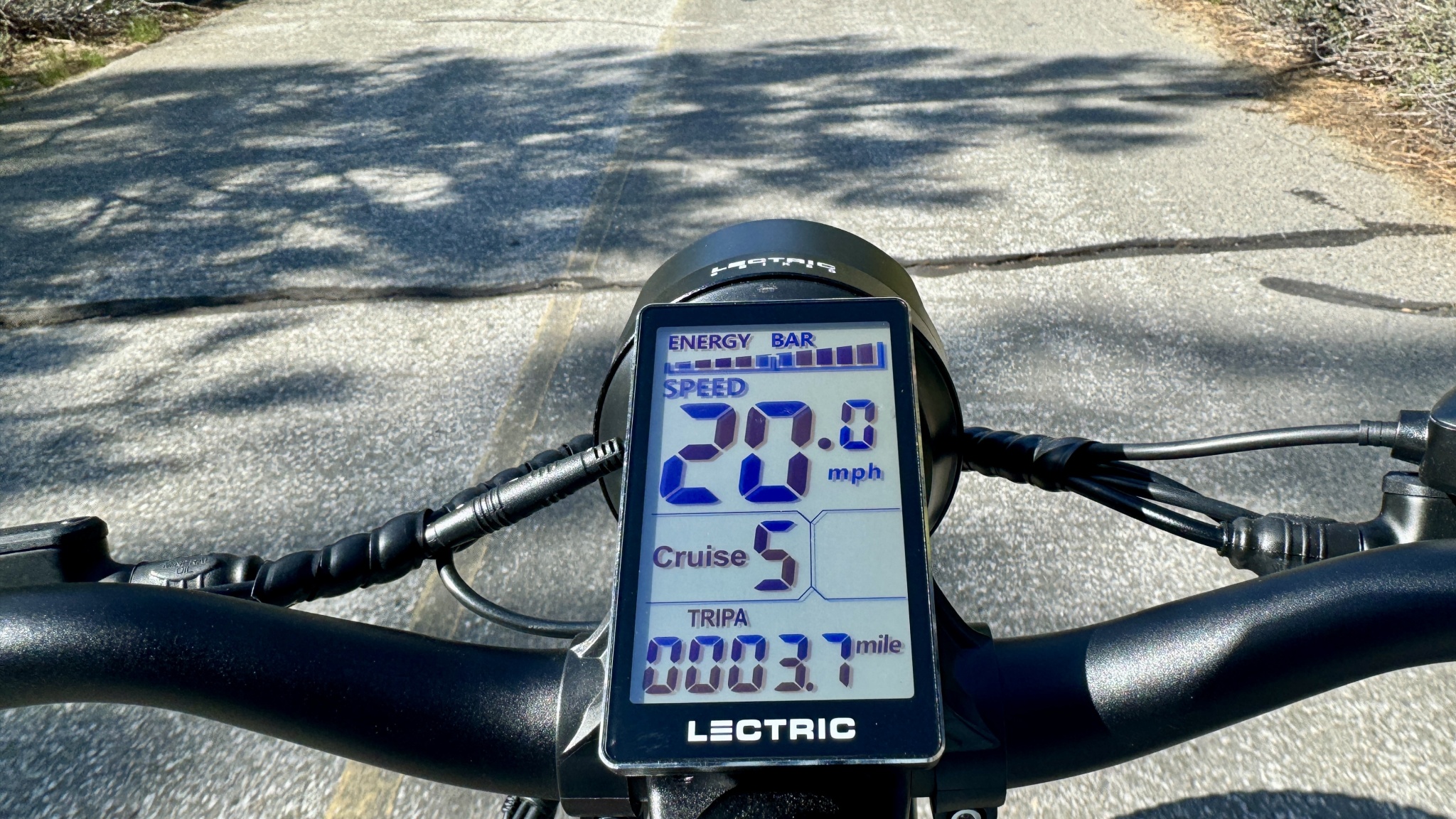 Lectric does a fantastic job with its large, centralized displays that are easy to ride and have an abundance of data. The display features numbers and graphics that make gleaning ride information quick and intuitive. The display measures 9cm from corner to corner and sits flush with the bike's headlight. At the top of the display is an energy bar with 10 ascending blocks that represent the battery's current state of charge. Current speed dominates the screen with large numbers and speed represented in mph or kph. Below your speed is the pedal assist setting (PAS), represented by numbers 1 through 5, and a space for the cruise control or walk function indicator. At the bottom of the display, a field shows an odometer, trip distance, voltage, current, or elapsed time.