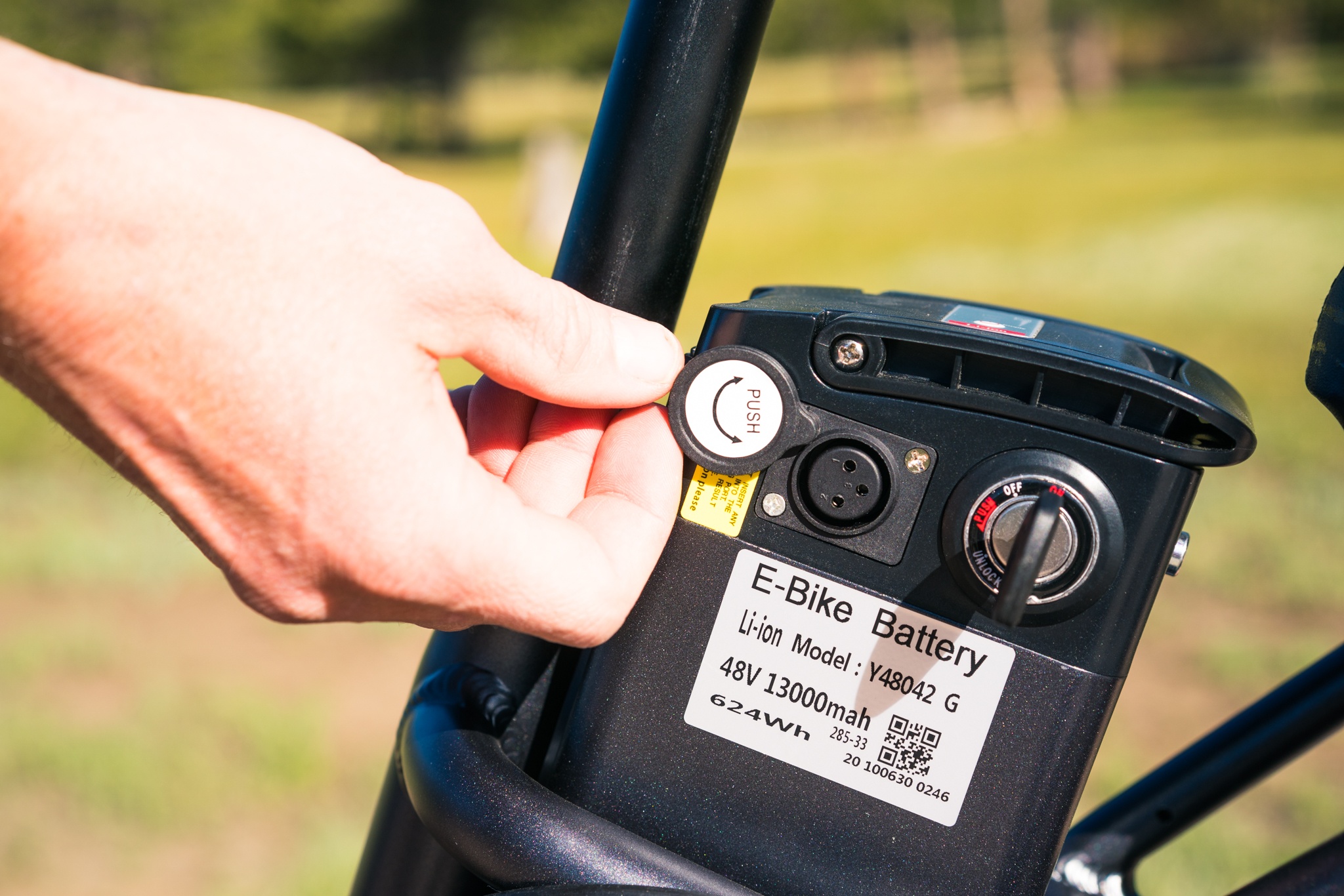 The Rattan Folding has a removable battery that slots into a cradle behind the seat tube. The battery is locked in place with a key and can easily be removed by pulling it up by the handle when it is unlocked. The battery can be charged on or off the bike, and Rattan claims a charging time of 6 hours for a fully depleted battery. One of our biggest complaints about this bike is that the battery rattles when riding over rough surfaces.