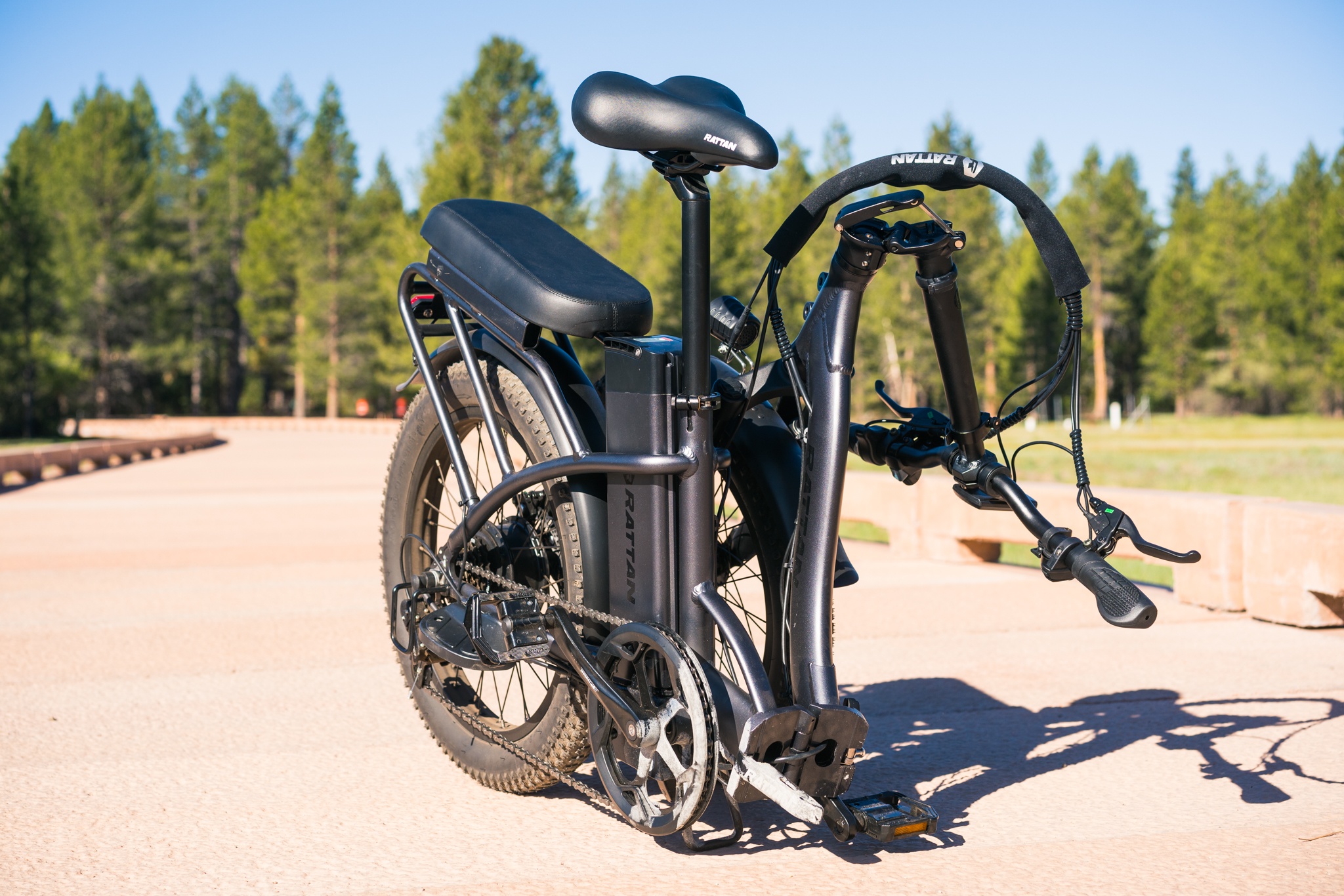The folding mechanism on this model is smack in the middle of the frame and at the base of the handlebar, with quick-release clamps on the upper handlebar extension and seat post that make breaking down and deploying this bike quick and easy. It's awkward to carry in its compact form, but the Rattan isn't alone in this among its relative competition. No surprises here.