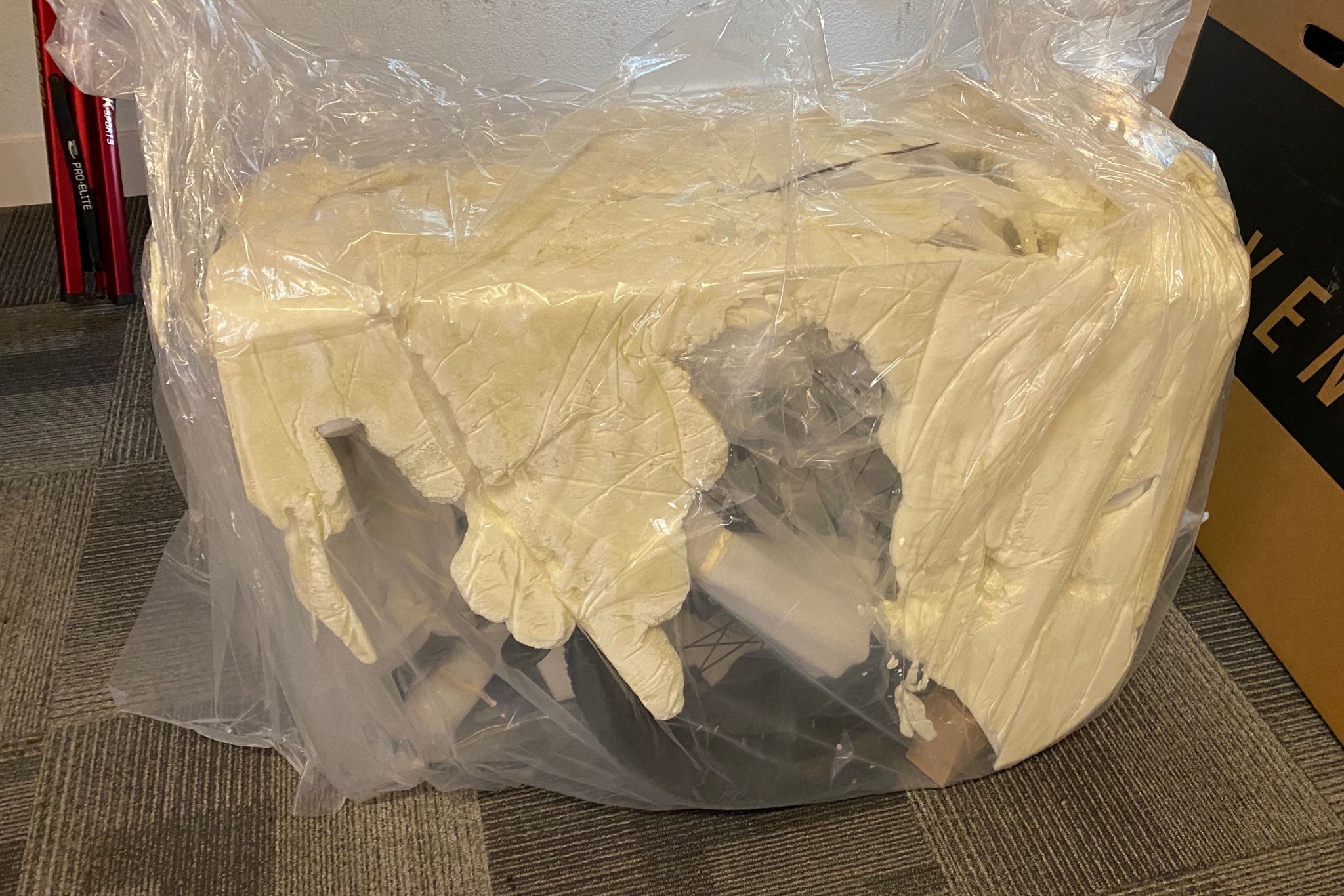 The Rattan comes in a bike box in its collapsed, folded position. Because the bike weighs 58 lbs, this box is still quite heavy, and removing the bike from it is easiest with two people. To protect the bike from shipping damage, Rattan takes an innovative approach by encasing the bike in a stiff spray foam within the box. To do this, they place the folded bike in a large plastic bag with a second plastic bag around it. The bike is then placed in the box, and the hardening foam is sprayed between the outer and inner bags. When the foam hardens, it creates a great protective barrier for the bike and prevents it from moving around within the box. Unfortunately, our bike tore a small hole in the inner bag, and a small amount of the spray foam leaked inside and stuck to part of the frame and the cranks. While removing the hardened foam from the bike is easy enough, it leaves an ugly residue that is nearly impossible to get off. So, our bike wasn't damaged from shipping, but it ended up with a less-than-perfect appearance from its protective packaging. We assume this isn't common, but it is notable nonetheless.