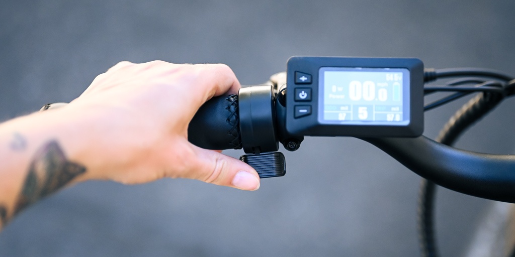 The controls of the 700-Series consist of a thumb paddle throttle and a display/control unit next to the left grip. The paddle throttle is immediately next to the grip, and it is easy to reach and press with the thumb. Next, the display has three buttons on its left side, closest to the tumb. The power button in the middle turns the bike on and off, while the + and - buttons shift up and down through the pedal assist levels. The display screen is fairly large, showing you everything you need to know at a glance. I tend to prefer displays centered on the handlebar, but this one is easy enough to see while riding, regardless of its location by the left grip. The screen has a dark background with bright numbers/letters, and we found it easy to read, even in direct sunlight. At the top of the screen, the wattage/power output of the motor is displayed in small numbers on the left side. The current speed is shown in large numbers in the middle, with a battery graphic on the right that shows the remaining charge in green (voltage is also displayed above, and it can be changed to a percentage if you prefer). Across the bottom of the screen, your pedal-assist setting is in the middle (0-5), the trip meter is on the right, and the total odometer is on the left.