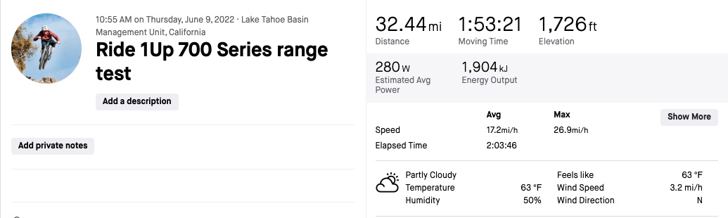A larger battery typically equates to a longer range, and that was the case with the 700-Series in our standardized throttle-only range test. With 720Wh of juice, we rode from a full charge to a dead battery over the course of 32.4 miles with 1,726 feet of elevation gain/loss without even pedaling, with an average speed of 17.2 mph. Ride1Up claims a range of 30-50 miles, and the 700-Series easily topped the low end of that range using full-electric/throttle power only.