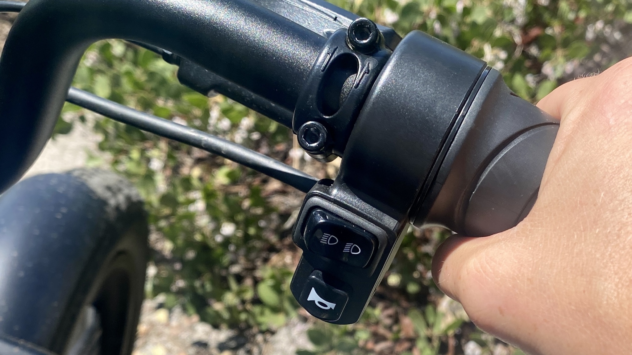 Throttle is intuitively controlled by a half length twist grip on the right side. The handlebar controls, including the power button, headlight switch, and horn, are conveniently located within reach of the rider's thumbs.In addition, the controls have a straightforward +/- button for switching between PAS settings. The main power button is located on the side of the battery, which resembles a gas tank. The opposite side of the battery has a clear LED display that indicates the current charge level.