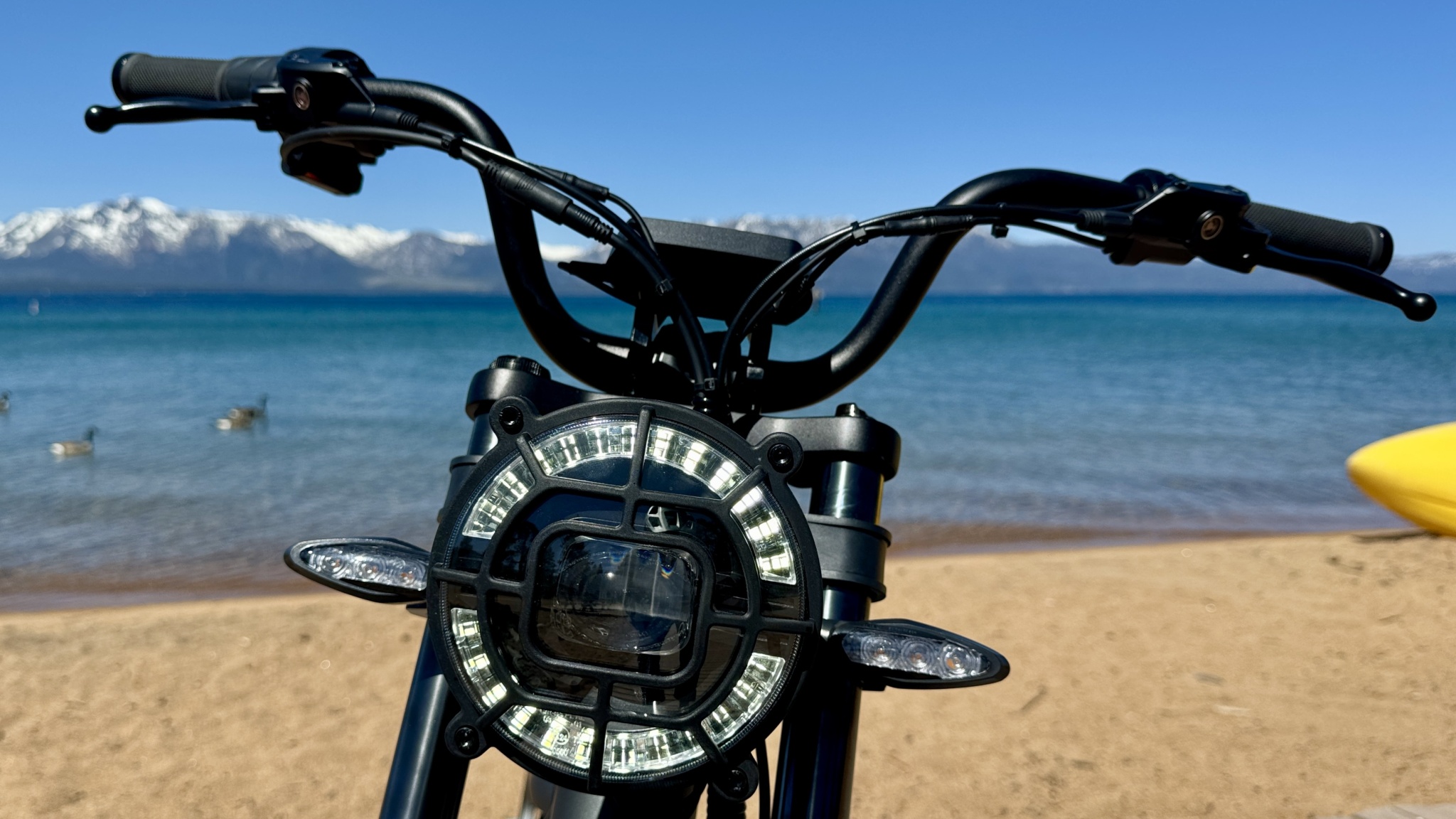 The 3.5" center mount display features turn signal indicators on this model, but notably not on the HT or DRT models. The LED backlit screen is easy to read with good contrast, even in direct sunlight. The display is chock full of relevant ride information, with current speed prominently displayed and several small icons that indicate the bike's settings. The battery and its state of charge are displayed graphically, with five bars at the top of the screen indicating a full charge. Next to the left grip is the bike's remote, where you power it on/off and change PAS modes. The right side of the handlebar features a twist throttle, headlight controls, turn signals, and a horn.