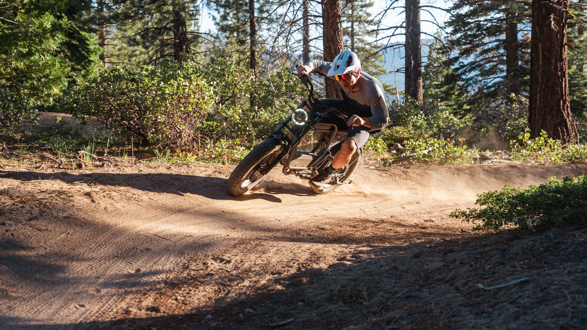 Switching to off-road mode, you understand why they say it's “for private property only,” and they clearly want to steer clear of the liability of people using a bike this quick and powerful on city streets. After just a few hundred feet at off-road speeds, I went to fetch the bigger helmet and more safety gear. The bike gets downright fast and quickly puts you at speeds that would be almost impossible on an analog bike. The bike no longer feels heavy, we found ourselves roosting up dust piles and pushing the bike skyward on jumps you'd never imagine taking a “moped” on. The bright and clear speedometer showed numbers in the 40+ range, but we were reluctant to take our eyes off the trail for long enough to give exact figures. Prolonged use on steep hills is eventually too much for the bike, since pedaling hard or shifting gears isn't feasible. There were times when we just needed to let the bike rest for a few minutes before it regained full power.