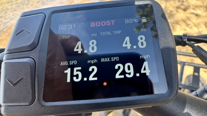 We were able to ride the Vorsa for 34.3 miles, which included almost 1800 feet of elevation gain/loss without pedaling. While falling short of the Segway Xafari in this metric, this is an outstanding distance to travel without pedaling. Of course, you'd travel much further using pedal assist; just how much would depend on your input and pedal assist setting. Ride1Up claims the bike can go 30-60 miles on a charge, and that might even be conservative if you're riding level terrain.