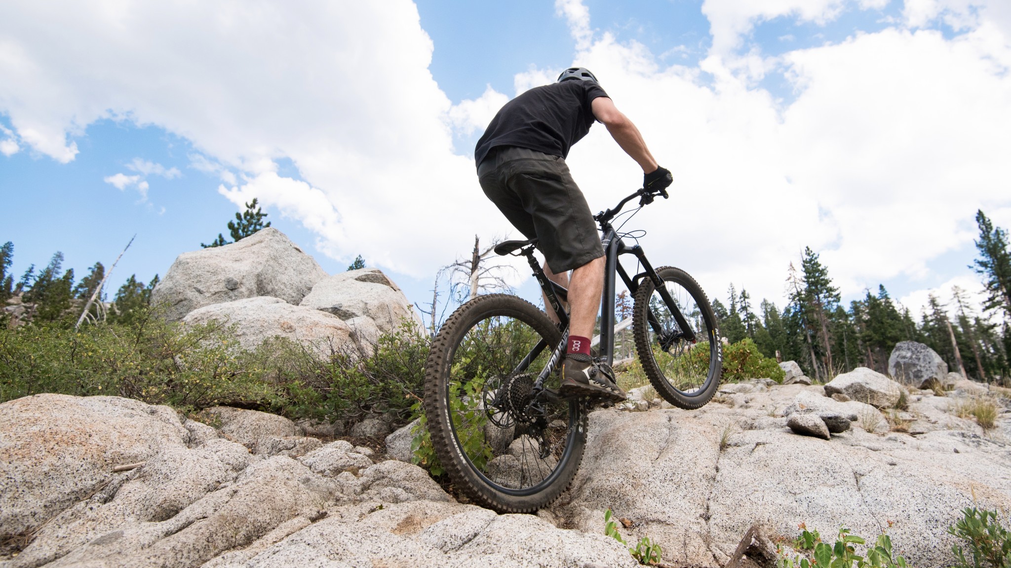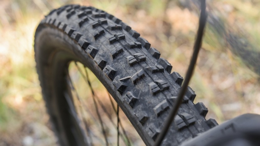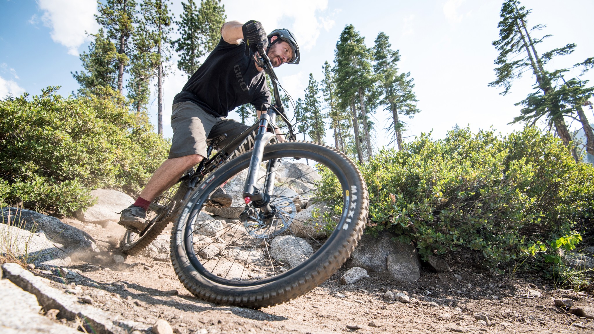 The rims wore a 2.4-inch Maxxis High Roller II in the front and a 2.3-inch Maxxis Minion DHR II in the rear. The High Roller II is an odd choice for a front tire and is normally reserved for the rear. We experienced a washy front end with this setup. We would flip this setup around and run the DHR up front.