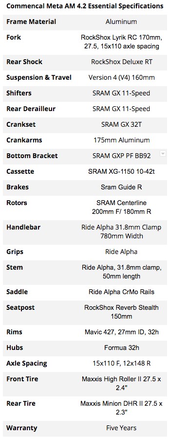 Five professional mountain bike testers spent ten weeks piloting four consumer-direct up and down Sierra singletrack. The Commencal Meta AM V4.2 Essential faced off against the 2017 YT Capra, 2017 YT Jeffsy, and playful 2017 Commencal Meta TR V4.2 Essential. We ranked these bikes by fun factor, climbing abilities, descending abilities and build specifications. The Commencal Meta AM scored a 65 out of 100 to finish second in our test, despite coming in last in our time trials. Our downhill course admittedly favored trail bikes over enduro rigs, with multiple pedaling sections giving the advantage to more efficient, less downhill focused bikes.