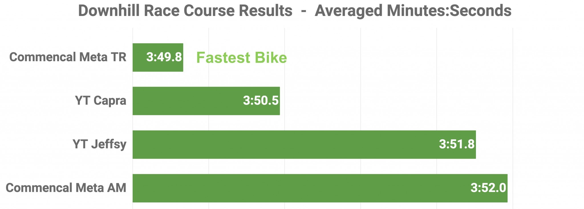 The Meta AM was our slowest climber in our timed uphill testing. The chart above shows how much faster the other three bikes were on average. The Jeffsy was the fastest bike followed by the Meta TR and Capra. Our test course was just shy of four minutes long and all bikes were within five seconds of one another.
