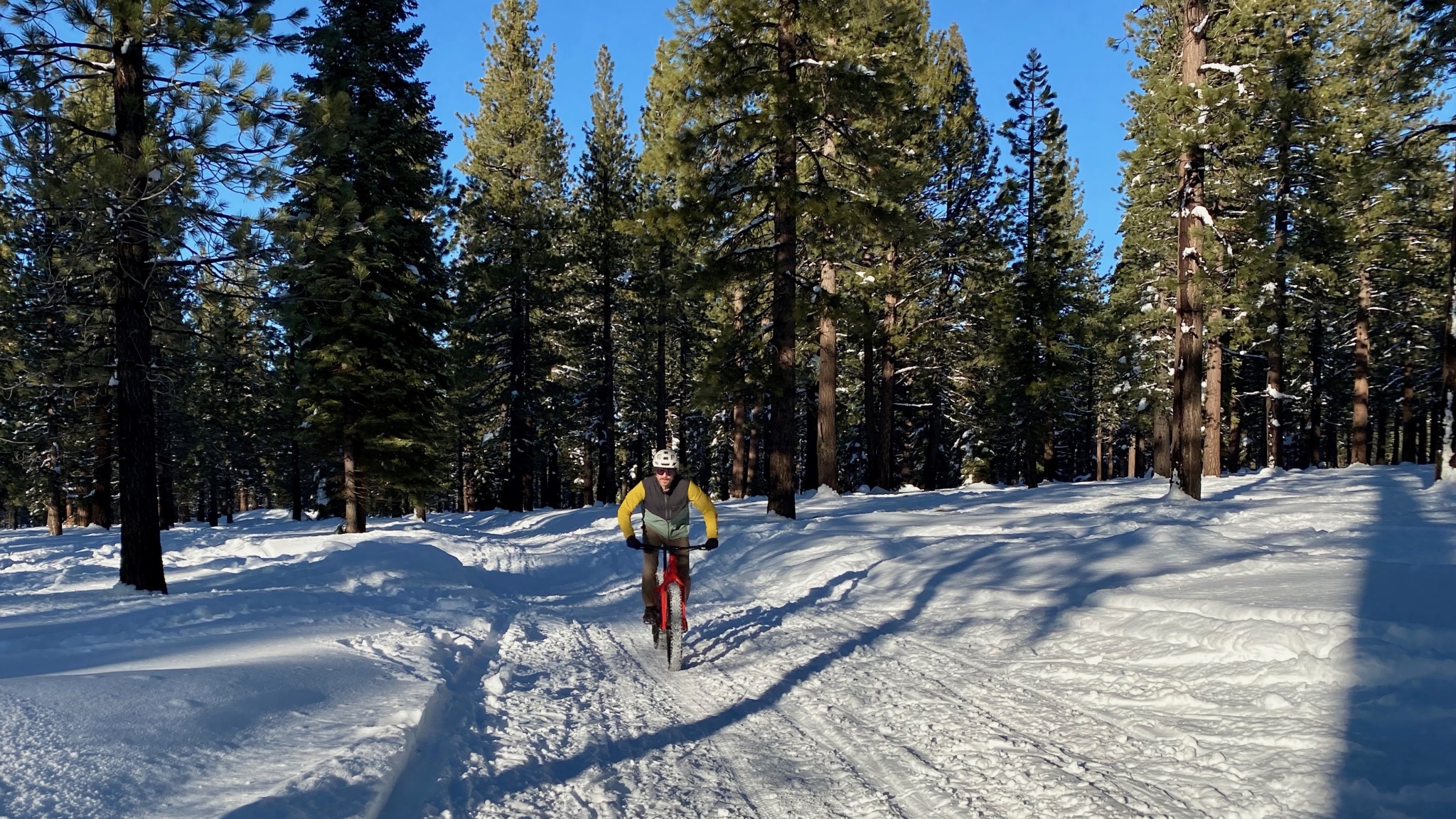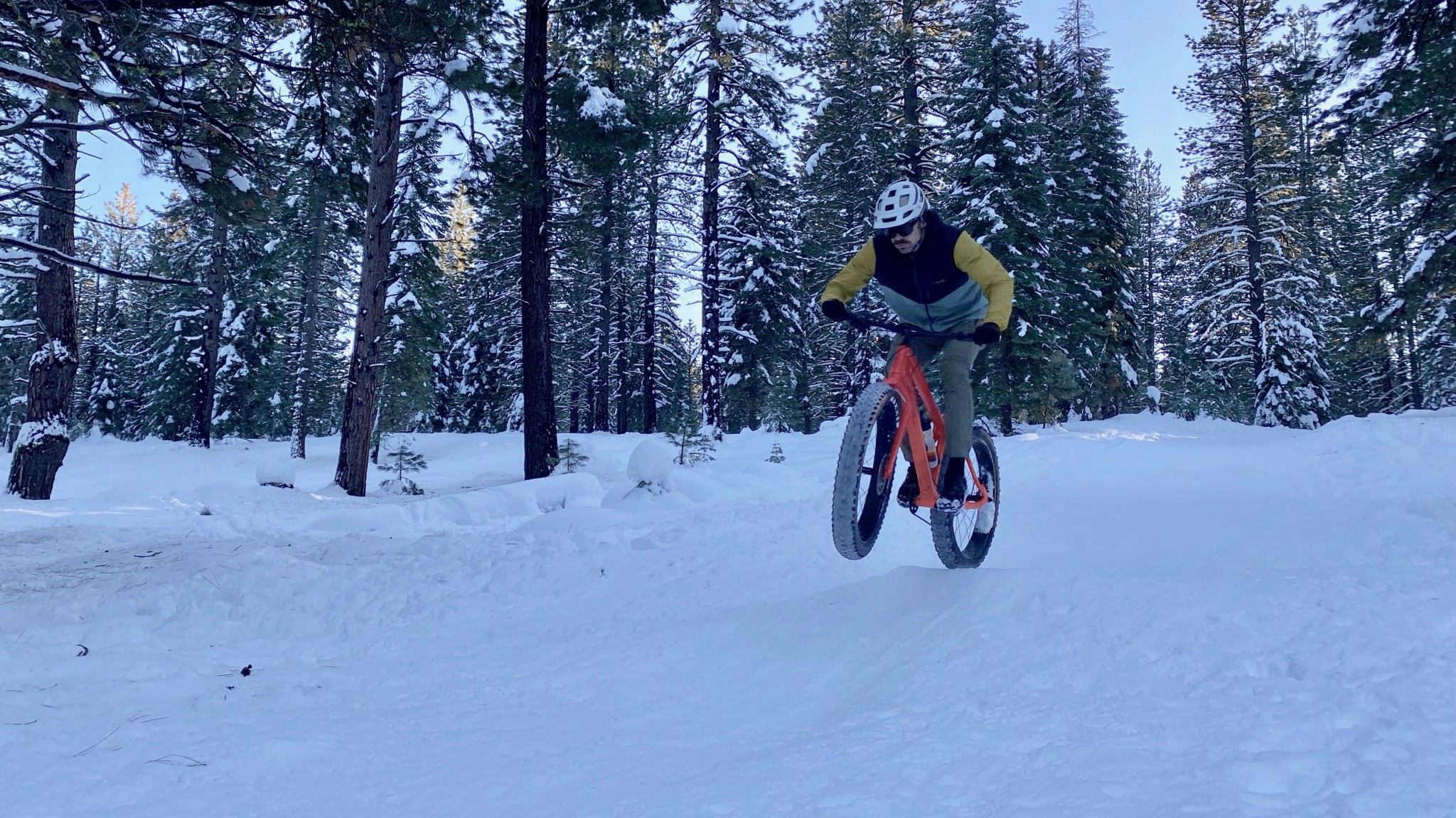 Riding in the flats or uphill is where the Canyon Dude impressed us the most. This bike is fairly lightweight, and the carbon frame is stiff and efficient when laying down the power. The geometry lends itself to responsive handling and a relatively comfortable seated pedaling position, whether you're grinding out a groomed track or scrambling up packed snow singletrack.