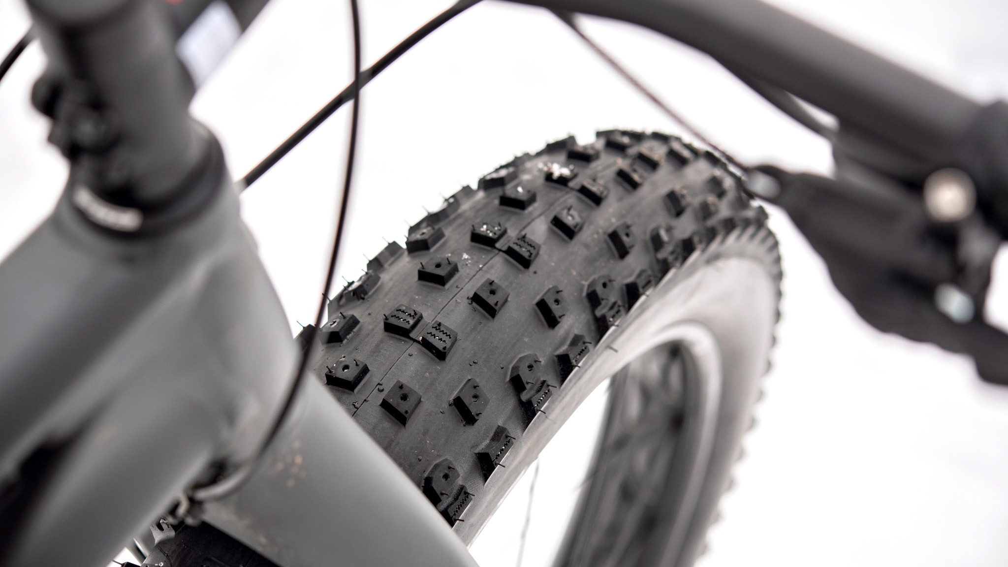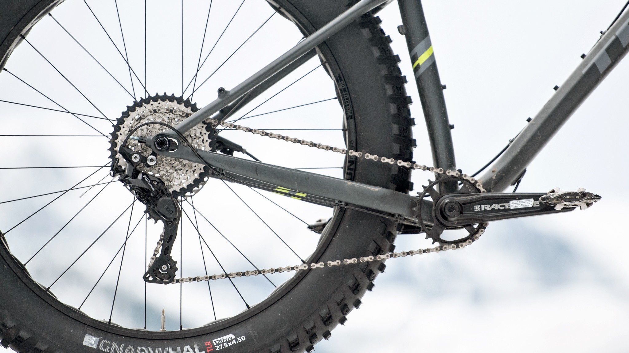 As with most fat bikes, the Farley 5 has SUNringle Mulefut rims. In this case, they are 80mm wide in a 27.5" size and are laced to a set of Bontrager hubs with 12 x 197mm rear and 15 x 150mm front axle spacing. We've read complaints online about the durability of these hubs, but ours worked well throughout our testing. The Farley is mounted up with massive 4.5" Bontrager Gnarwhal tires. These tires provide excellent floatation and impressive traction on both snow and dirt. Due to the girth of these tires, testers expected the Farley to roll slower and generally feel more sluggish side to side, but that was not the case. The 15.5" and 17.5" frame sizes of this bike come with a 4.5" Bontrager Barbegazi rear tire.
