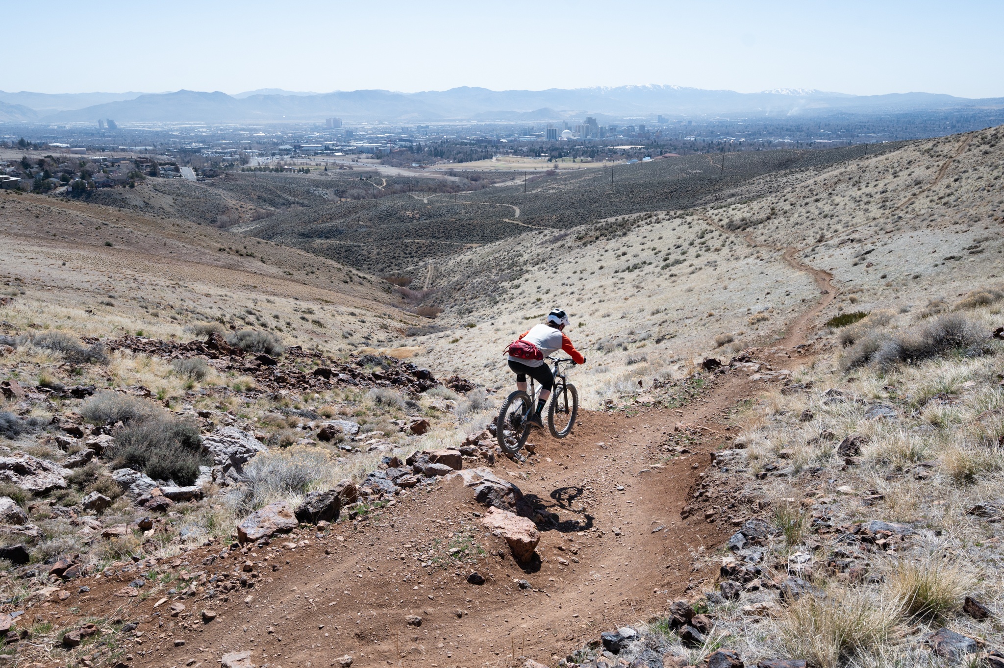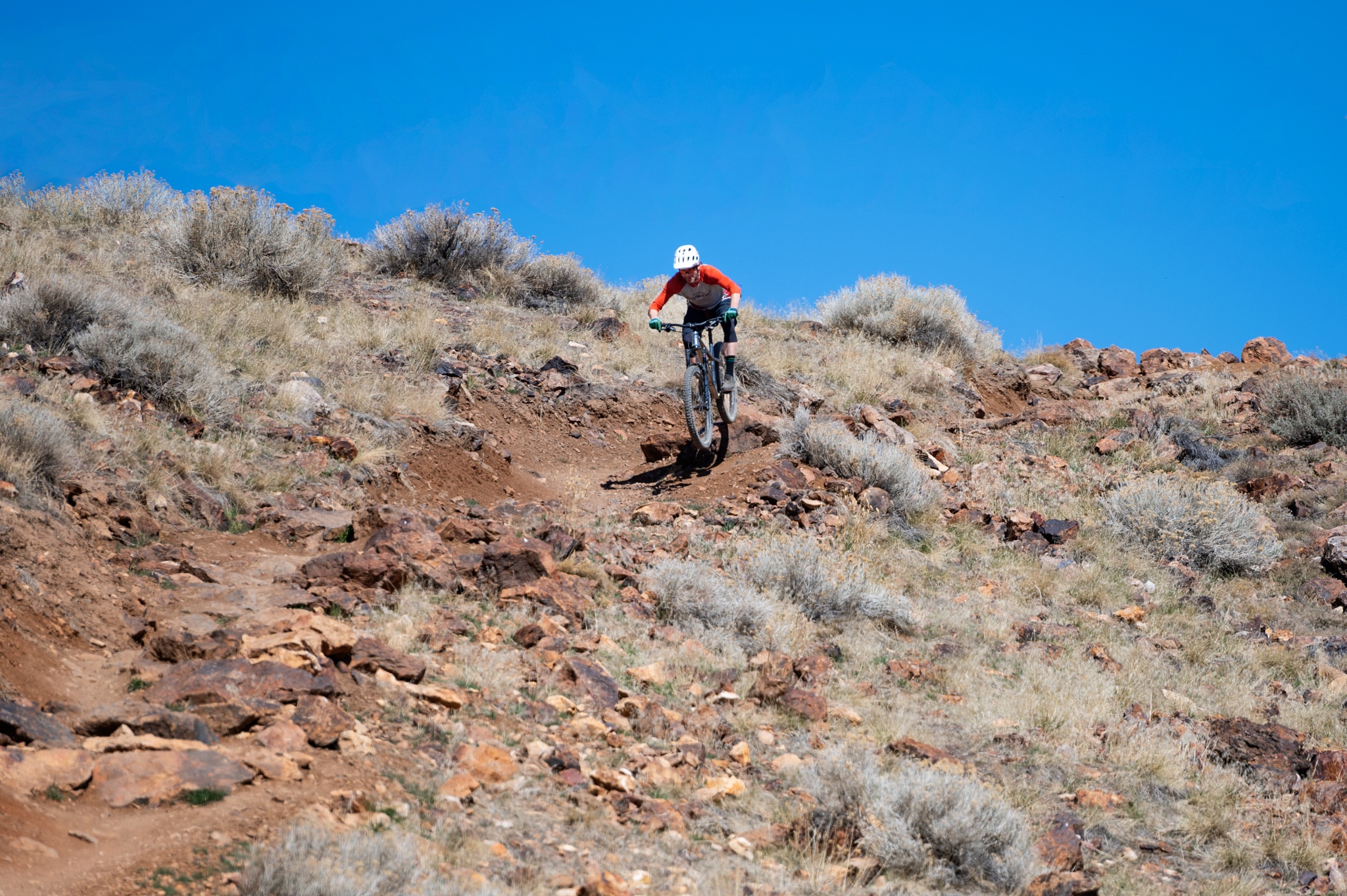 With 27.5-inch wheels and girthy, plus-sized tires, the Meta HT AM inherently doesn't roll quite as swiftly as bikes with larger wheels. Those big ol' tires create a bit of drag, but they also have a huge contact patch and can be run at lower pressures to get heaps of climbing traction. The Maxxis Rekon that comes on the rear wheel has relatively low rolling resistance and hooks up well on firm dirt and rock, but falters a little in super loose conditions. The Fabric Scoop Flat Sport saddle proved to be surprisingly comfortable and pleasant for those long seated climbs. The SRAM SX Eagle 12-speed drivetrain is the least impressive aspect of the Essential build, but it provides a huge range and it worked better than SX has worked for us on other bikes.