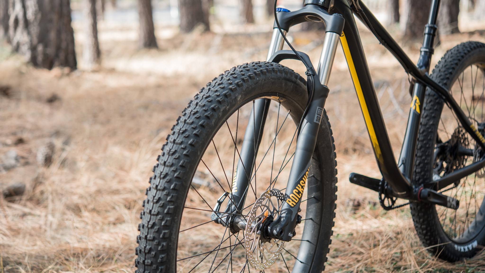 The Maxxis Rekon 27.5 x 2.8 tires are a nice specification. After testing a substantial amount of plus-sized tires, we much prefer the responsiveness and the more aggressive feel of 2.8-inch tires compared to the wider 3.0-inch options. The Rekon has defined and reliable shoulder knobs that add to the responsive and confident feeling of the narrower tires.