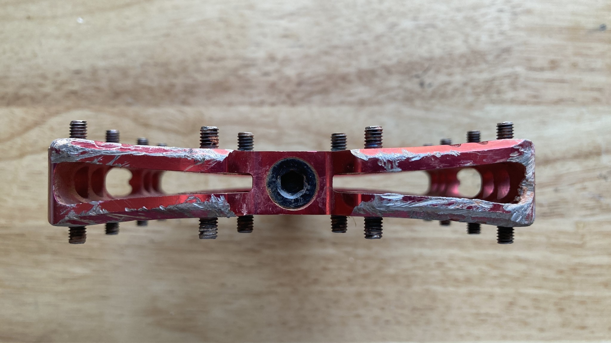 The pedal grips so well that it is hard to reposition your foot in the middle of your descent. The more you ride, the more you get used to this, but it is worthy of mention. The large size combined with the 19 mm leading edge thickness does present more potential for pedal strikes and contact with other features on the trail. We didn't experience any strikes that caused a crash while testing, but we made plenty of pedal-to-rock contact. The most vulnerable spots for contact are the leading edge and the outside edges of the pedal. The thickness of these pedals does make them less ideal for trail riders or those who frequent technical trails.