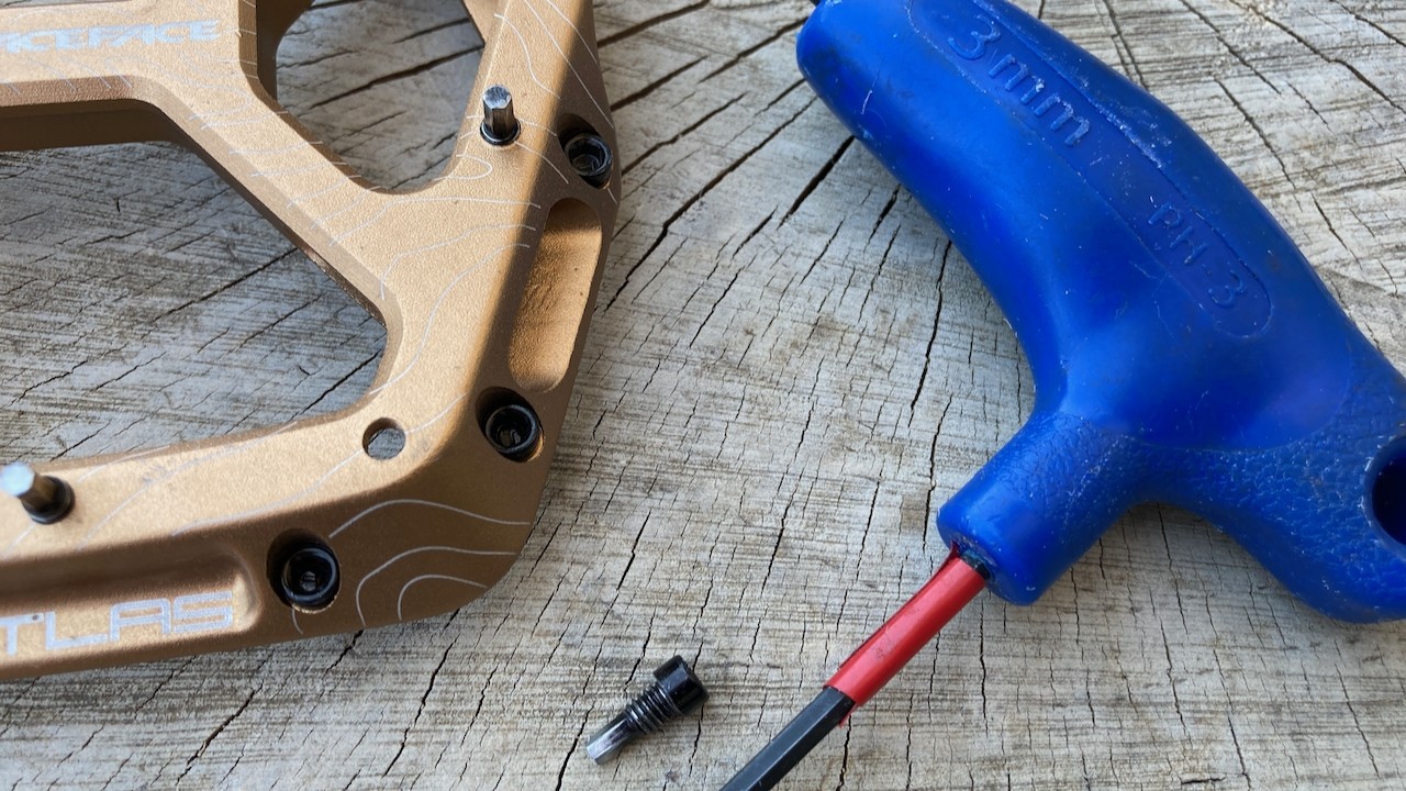 Race Face provides four replacement pins and 40 washers with the Atlas pedal. The pins are loaded from the bottom of the pedal, and a three-millimeter hex is required to replace them. Depending on the location of a bent pin, it can be easy to remove or require a little more patience. On one side of the pedal, the pins are easily accessible; on the opposite side, they are slightly recessed. Bent pins on the recessed side can take a bit more finesse to extract if they are bent.